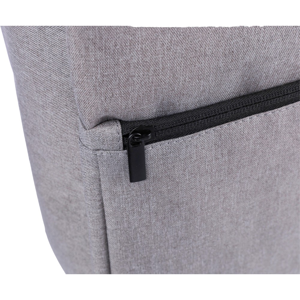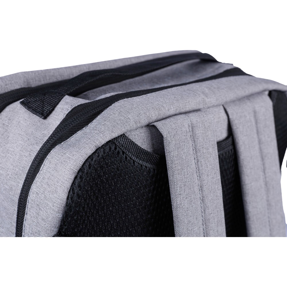 Hátizsák és laptoptáska 15"-es készülékhez. Kézipoggyász méretű. Hordozófüllel a tetején, állítható vállpántokkal és két oldalsó fogantyúval. Az állítható pántok a párnázás mögé rejthetők, így az oldalsó fogantyúkkal is hordozható. Tépőzáras laptoprekesszel és kis cipzáras zsebbel rendelkezik. Szellőző, párnázott hátoldallal. Terhelhetősége kb. 8 kg. RPET alapanyagra utaló címkével. Anyaga: 300D RPET poliészter.