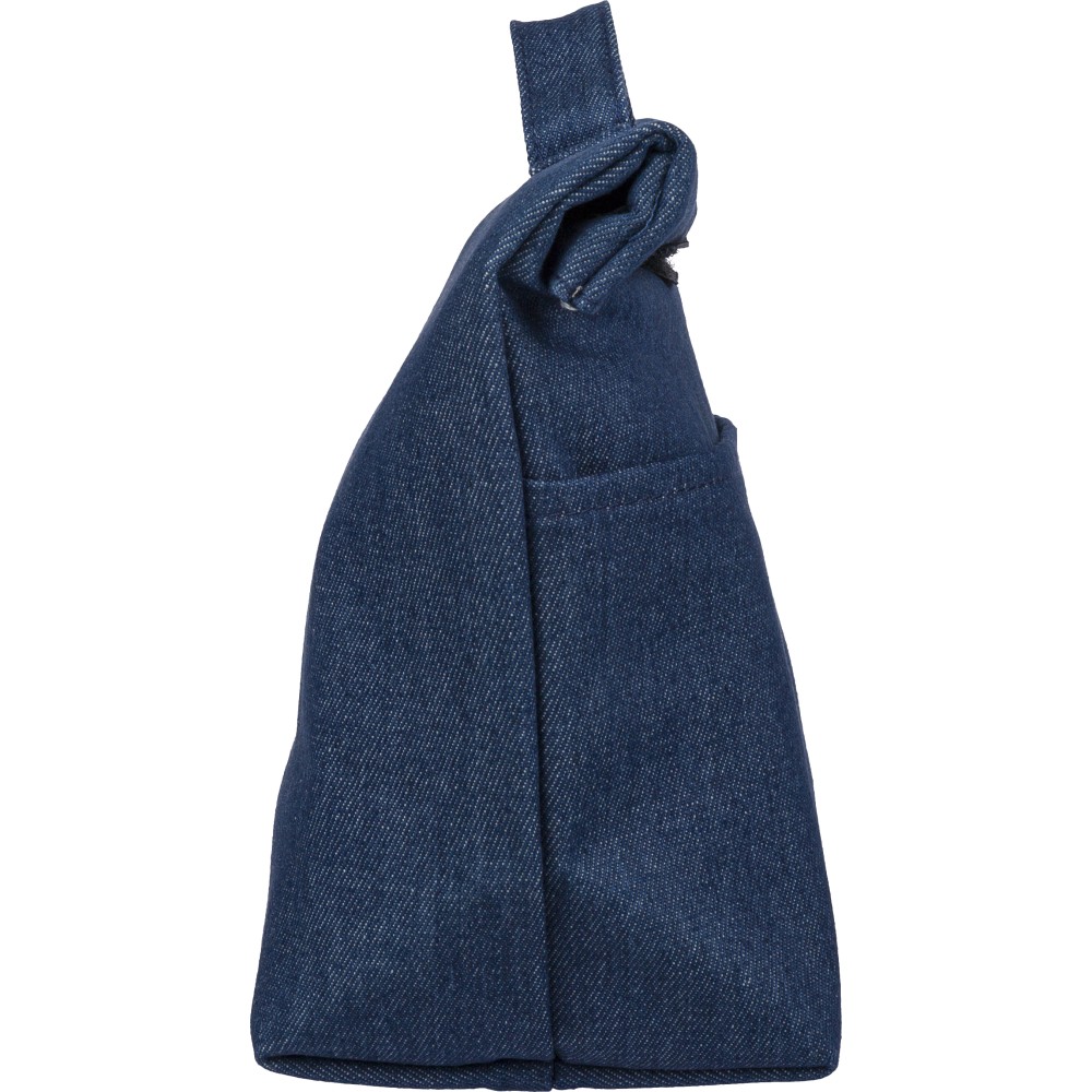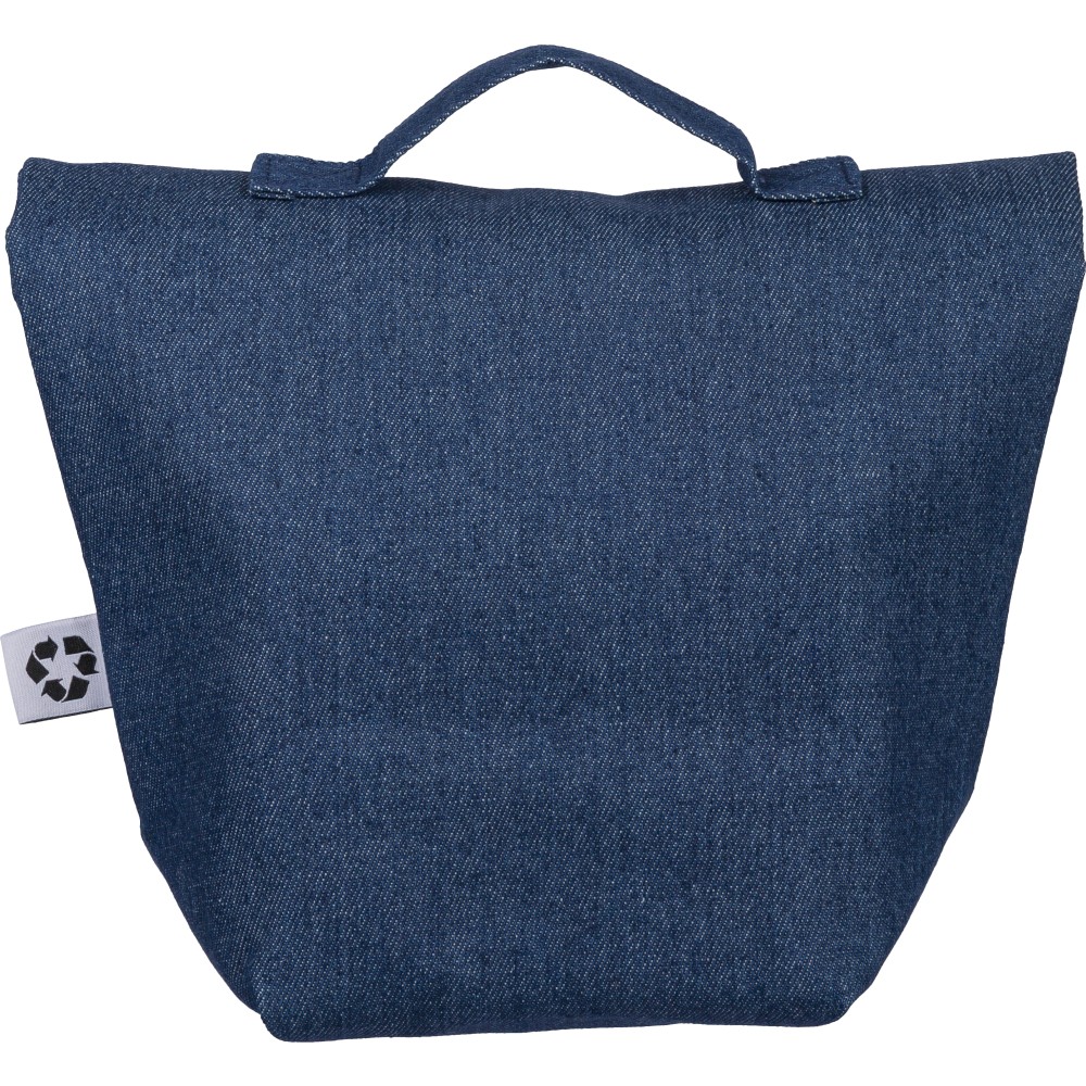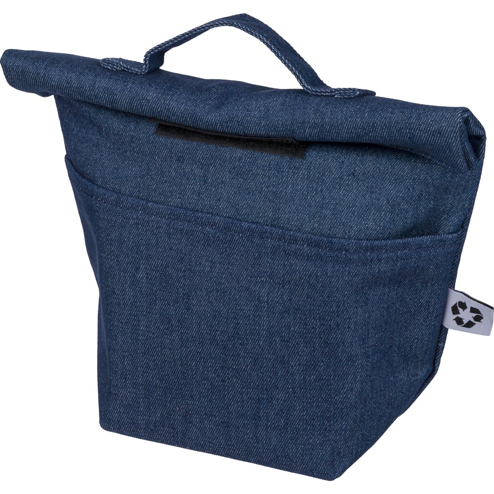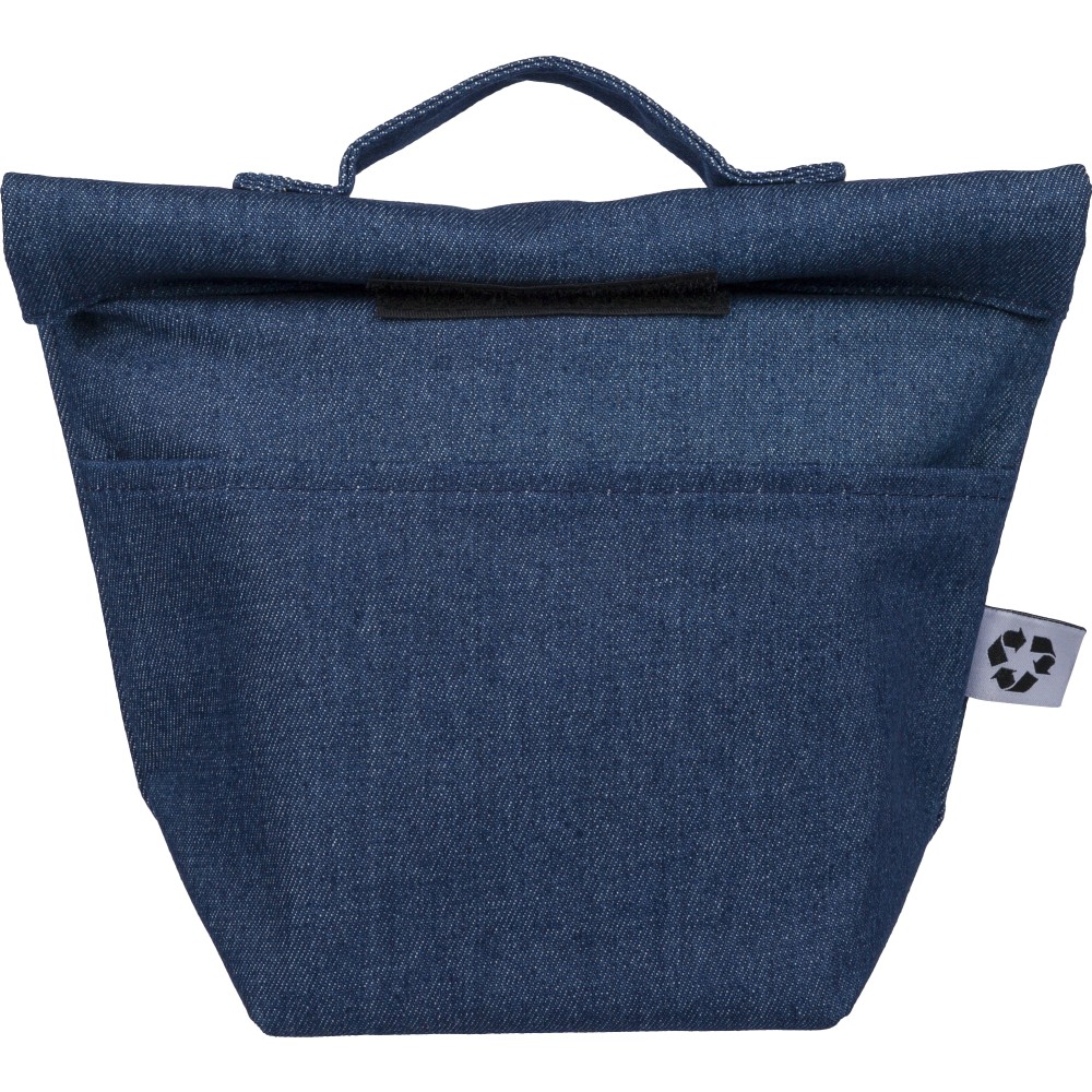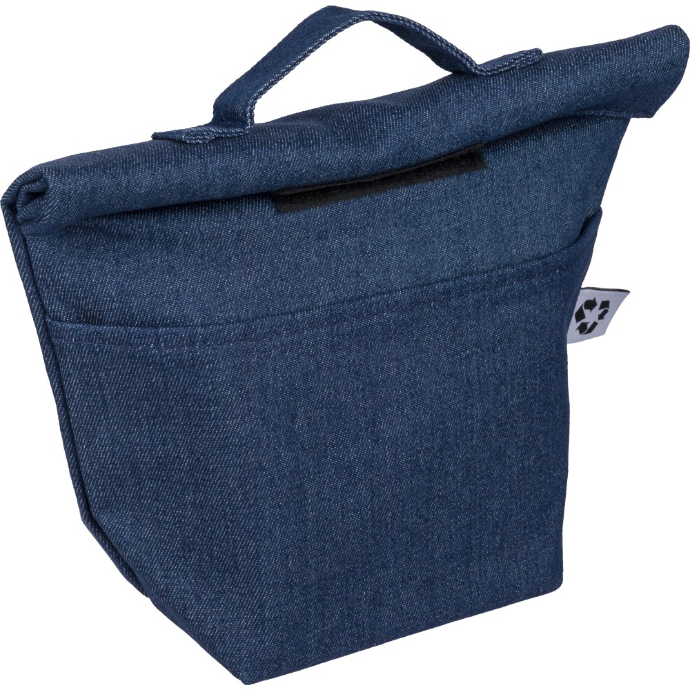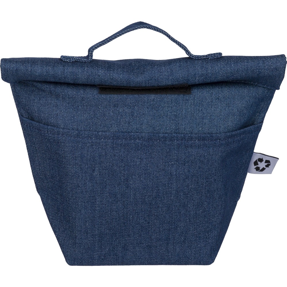 Újrahasznosított farmeranyagból készült, 27 × 10 × 31 cm méretű roll-top kialakítású hűtőtáska tépőzáras záródással, PEVA belső réteggel és rövid fogantyúval. Elülső zsebbel és a külső felületen elhelyezett újrahasznosított alapanyagra utaló címkével ellátva.