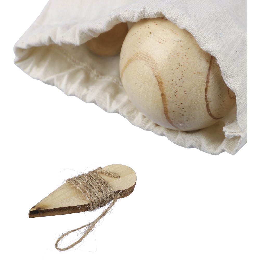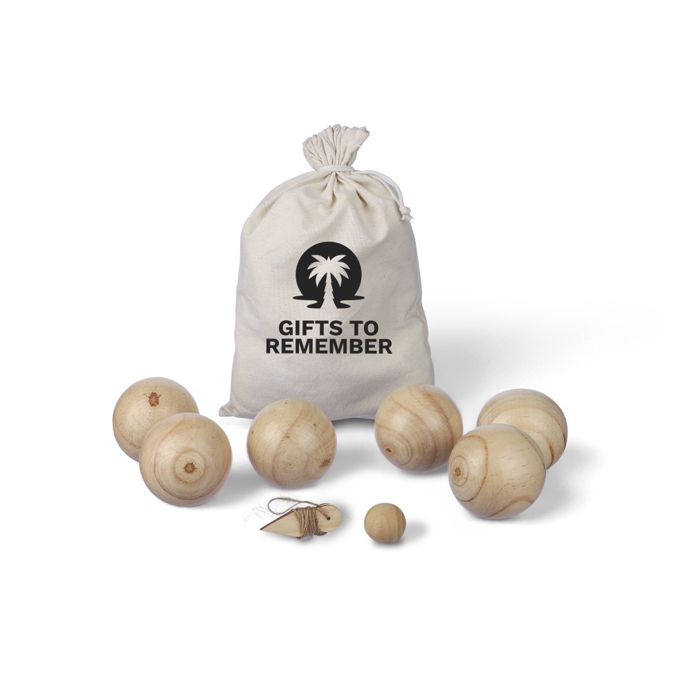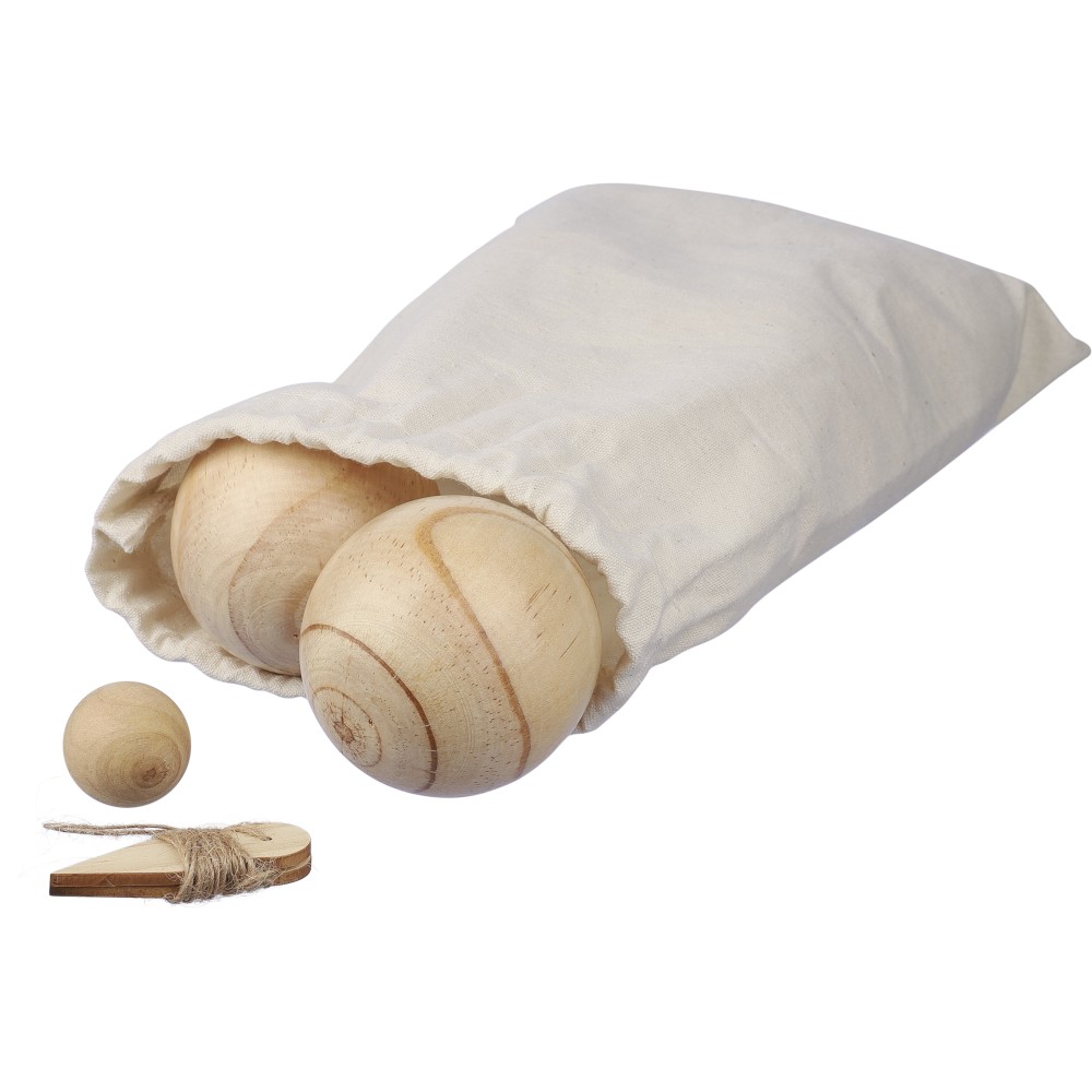 Fa labdajáték készlet 6 db, egyenként 7 cm átmérőjű labdával, egy kisebb, 2 cm-es golyóval és mérőzsinórral. Vászontasakba csomagolva. 4-6 játékos számára.