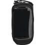 Kormányra szerelhető biciklistáska fényvisszaverő csíkokkal, telefontartóval. A PVC telefontartó zseb nem akadályozza az érintőképernyős telefonok kezelését sem. A táska egyik oldalán nyílás található a fülhallgató kivezetéséhez. A kormányra tépőzárral rögzíthető. 600D poliészter és PVC.
