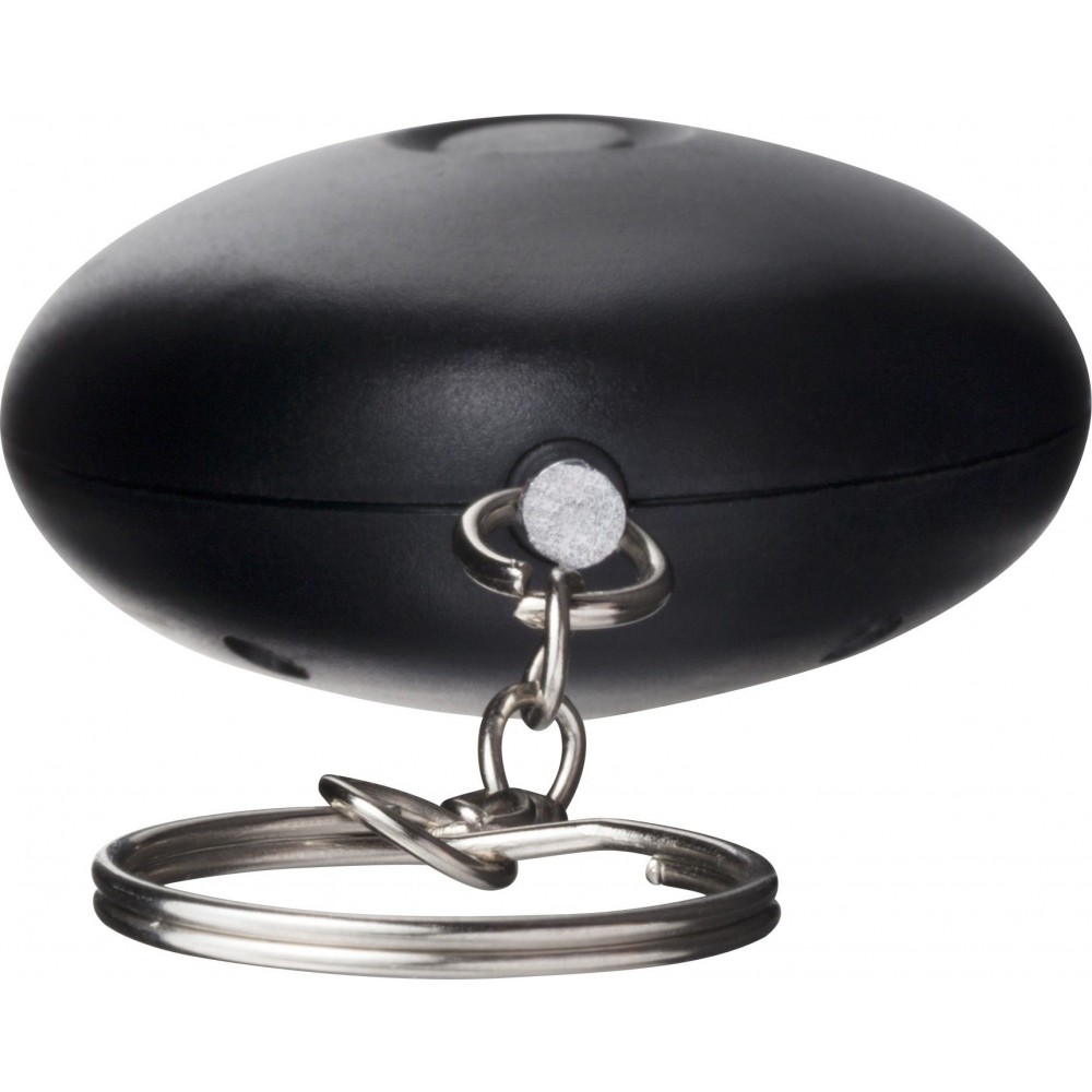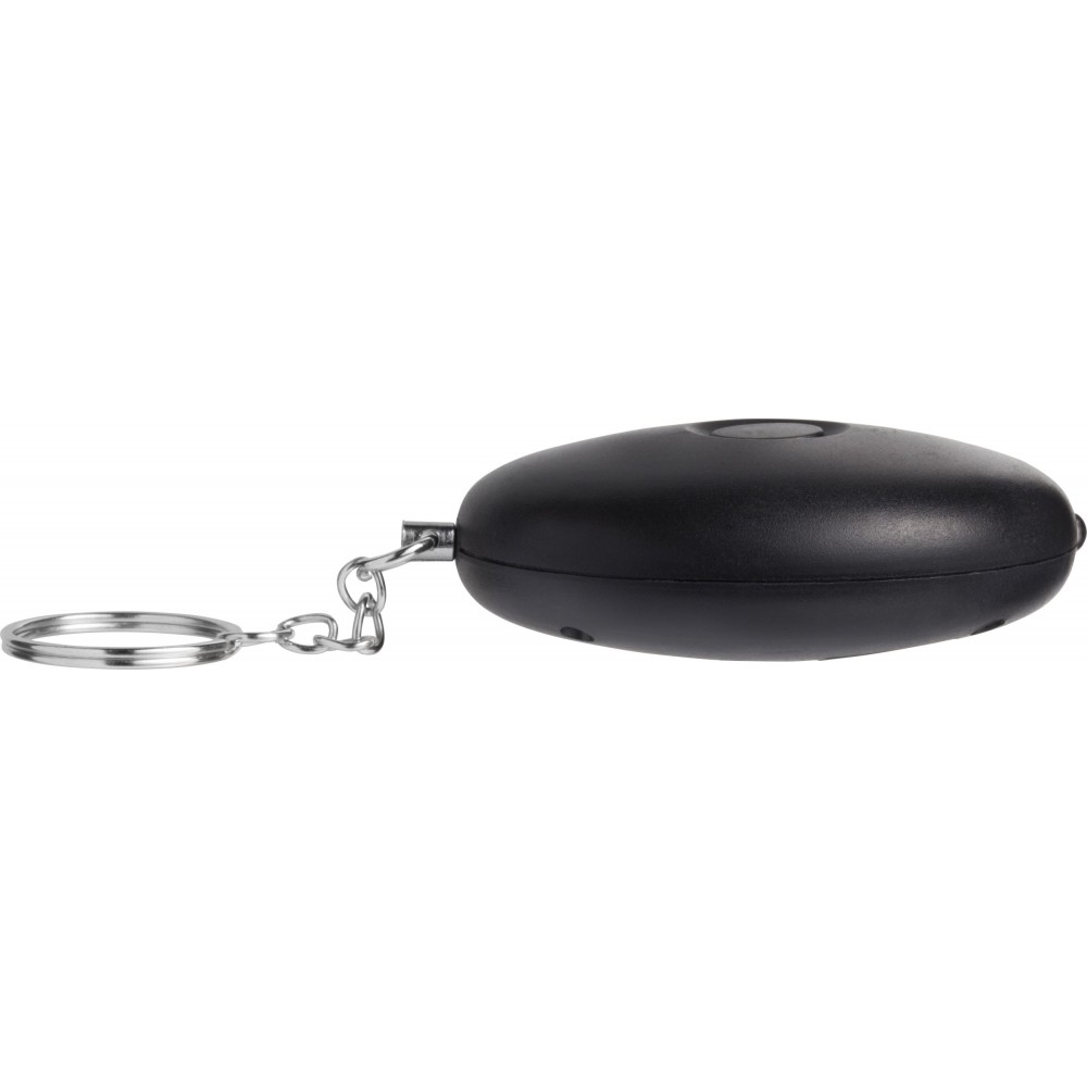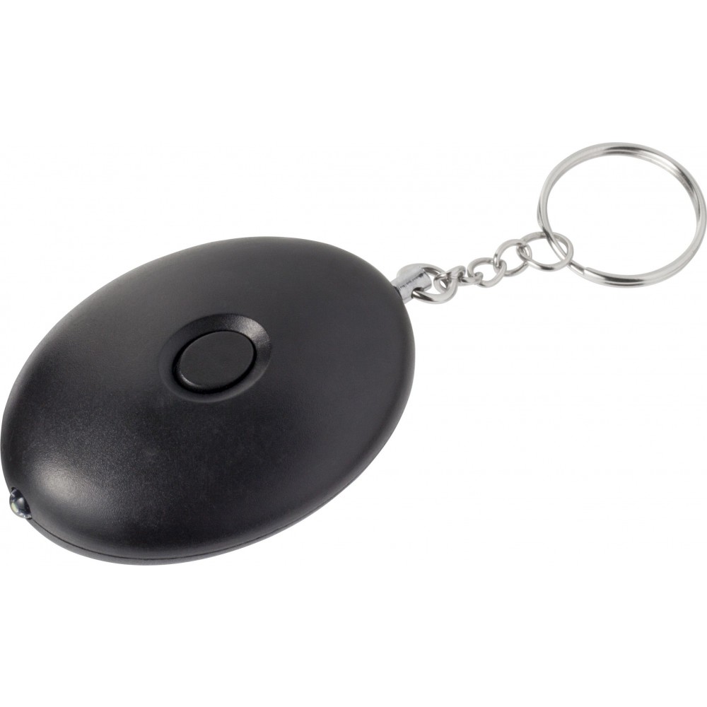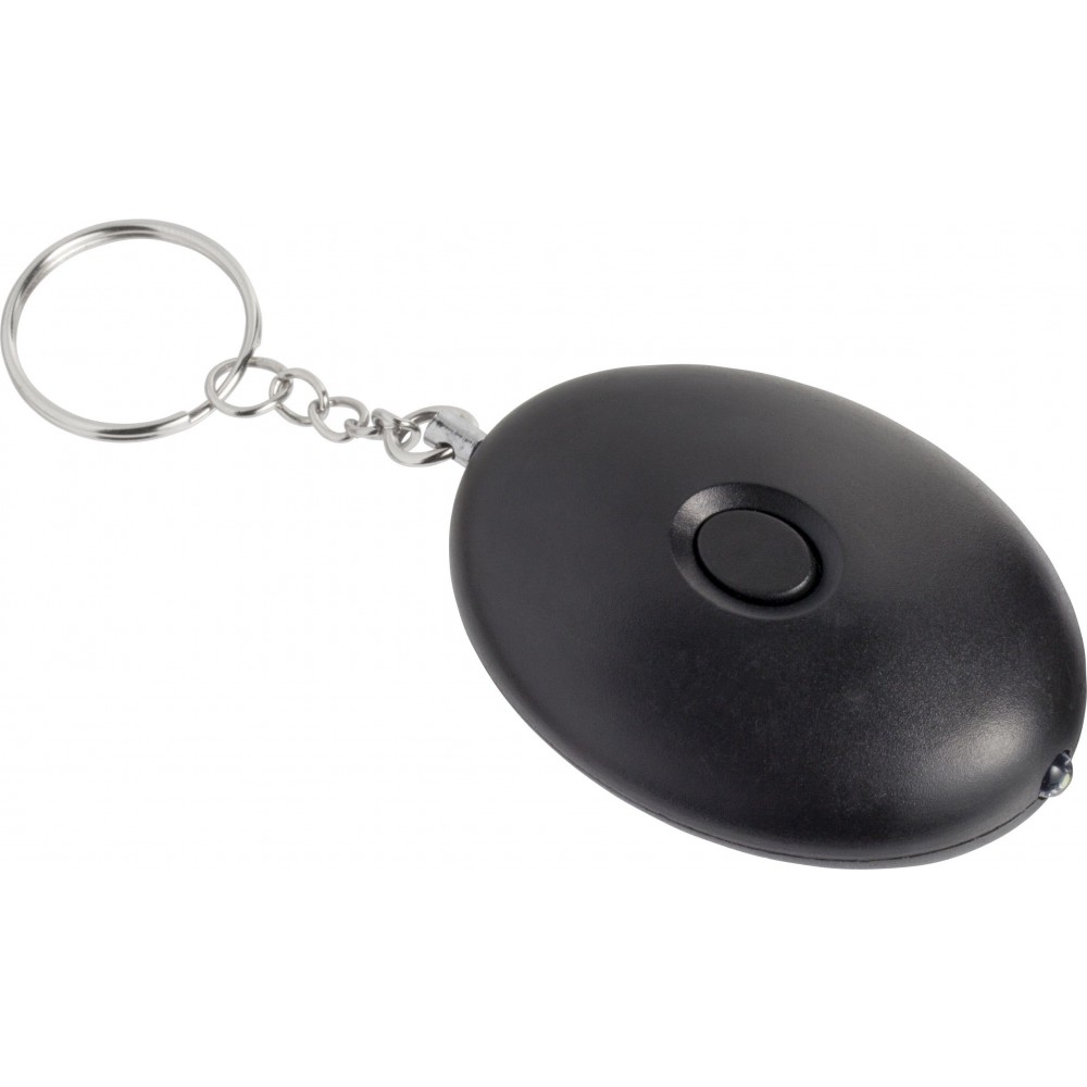 Riasztó kulcstartóval. A LED-lámpa és a riasztó hangja gombbal indítható el. Az elemet tartalmazza. 102 dB-lel szól. ABS műanyag.