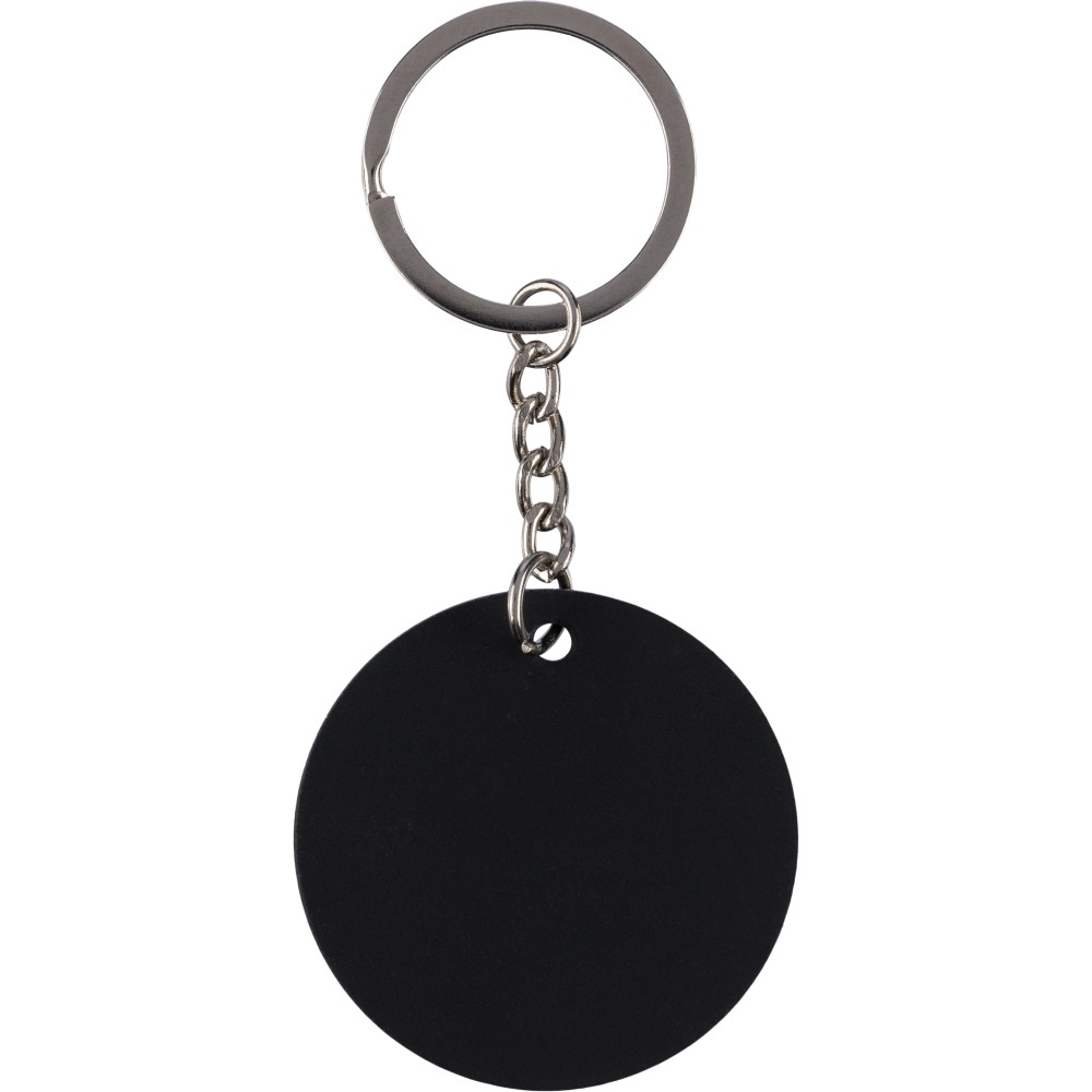 Újrahasznosított rozsdamentes acélból készült, gumírozott felületű, kerek kulcstartó fém karikával. A kulcstartón gravírozott recycled (újrahasznosított) alapanyagra utaló logó található, amely gravírozás után fényes, tükörszerű hatást mutat. Egyenként kraft papírtasakba csomagolva.