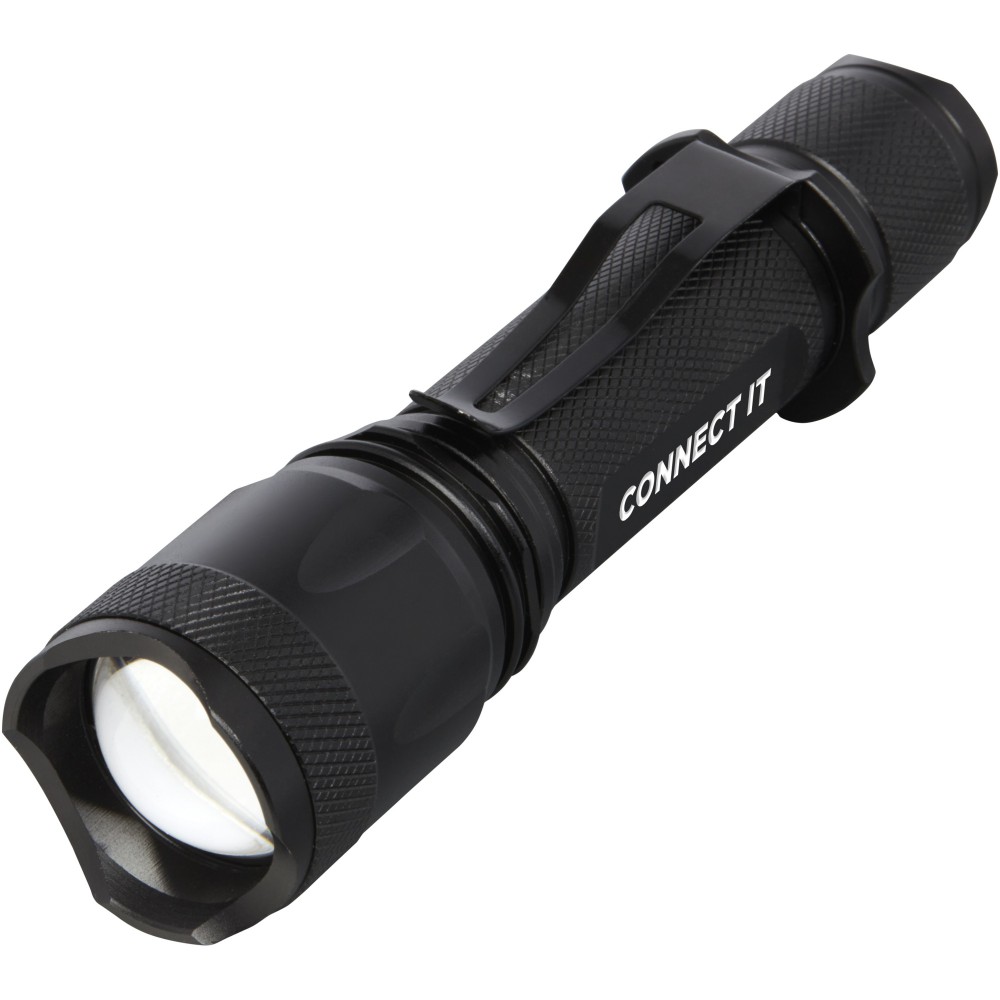 Soha nem merül le az akkumulátor ezzel az újratölthető, nagy teljesítményű taktikai alumínium zseblámpával. A tömör fekete alumíniumötvözet burkolat profi megjelenést biztosít, 1 méteres ütésállósággal. A zseblámpa övcsipesszel rendelkezik a könnyű hordozhatóság érdekében, és az IPX4 besorolású, fröccsenésálló. Az 5 W-os LED 300 lumen fényerőt állít elő 3 órán keresztül, sugártávolsága pedig 200 méter 5 különböző fénybeállítással: magas, közepes, alacsony, villogó és SOS. A nagy teljesítményt egy beépített lítium akkumulátor adja, amelynek kapacitása 2000 mAh. Rejtett USB csatlakozó a töltéshez, amely a lámpa felső részének kihúzásakor válik elérhetővé. A zseblámpa mérete 14,5 x 3,4 cm, súlya pedig mindössze 170 gramm. Használati útmutatóval adjuk, és 17,5 x 6 x 4 cm-es újrahasznosított karton díszdobozba csomagoljuk. Az alumínium testre lézeres gravírozás javasolt.