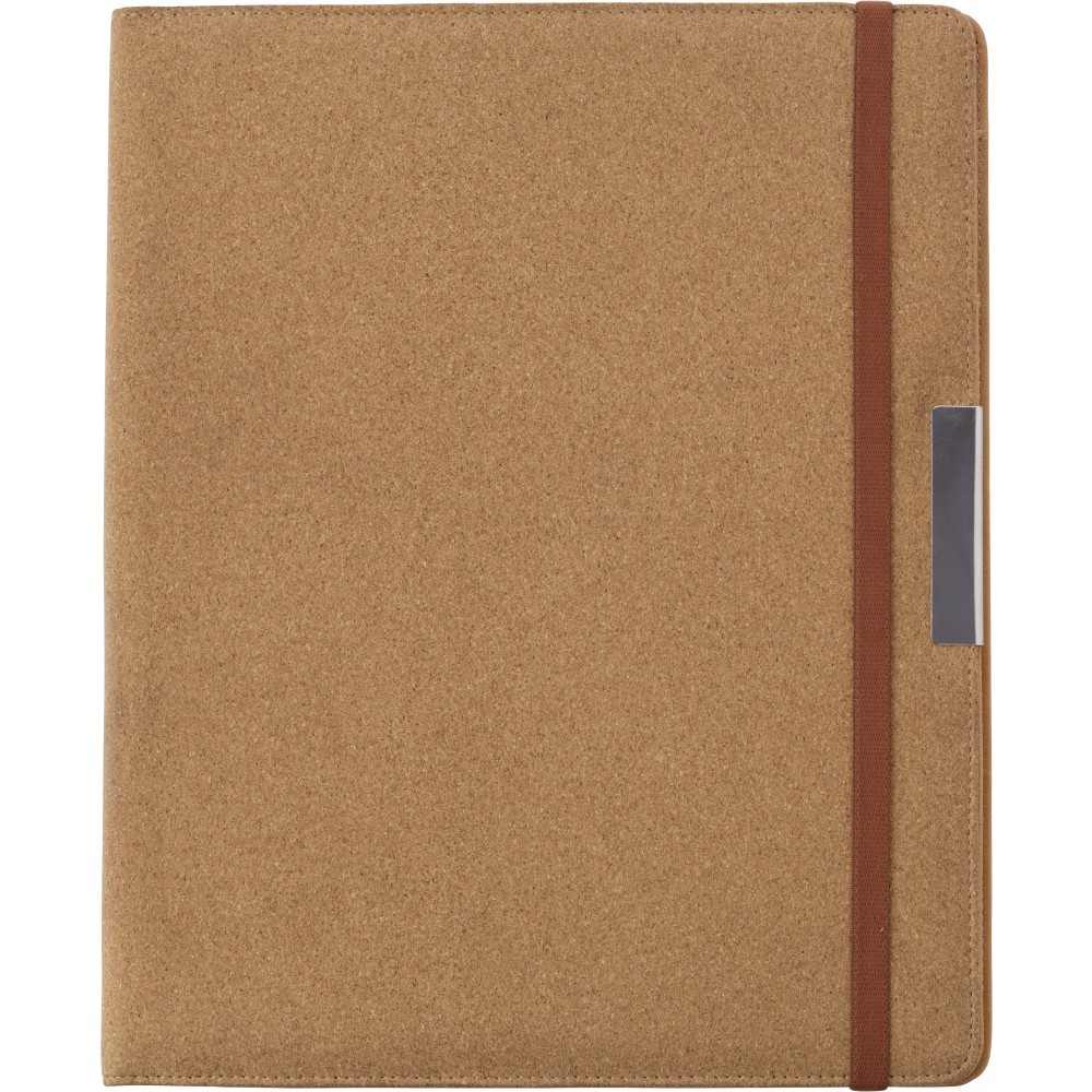 A4-es méretű parafa mappa gumis zárópánttal, PU belsővel, kicsi hálós névjegytartó zsebbel, egy nagyobb zsebbel, 20 lapos jegyzettömbbel és tolltartó füllel (a tollat nem tartalmazza).