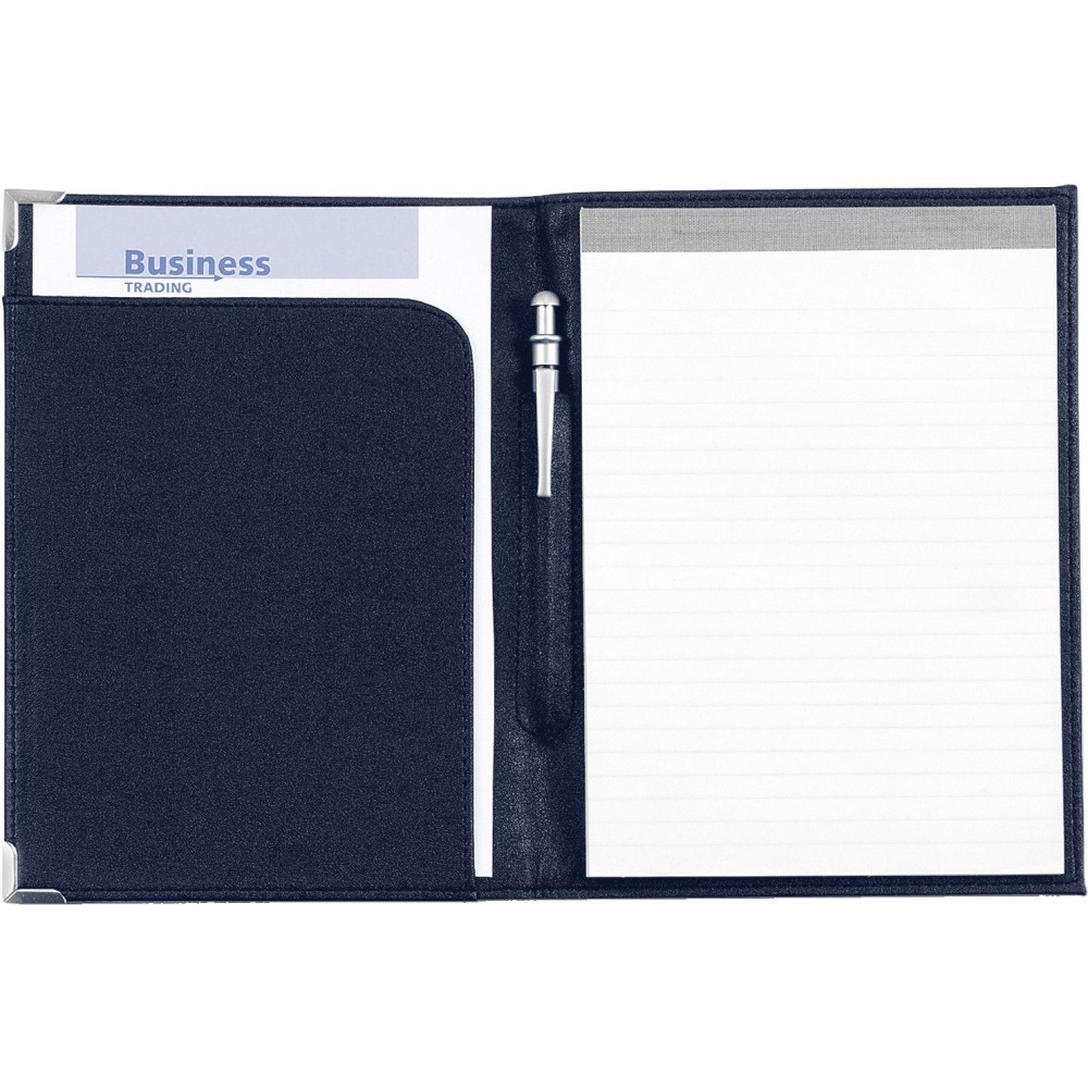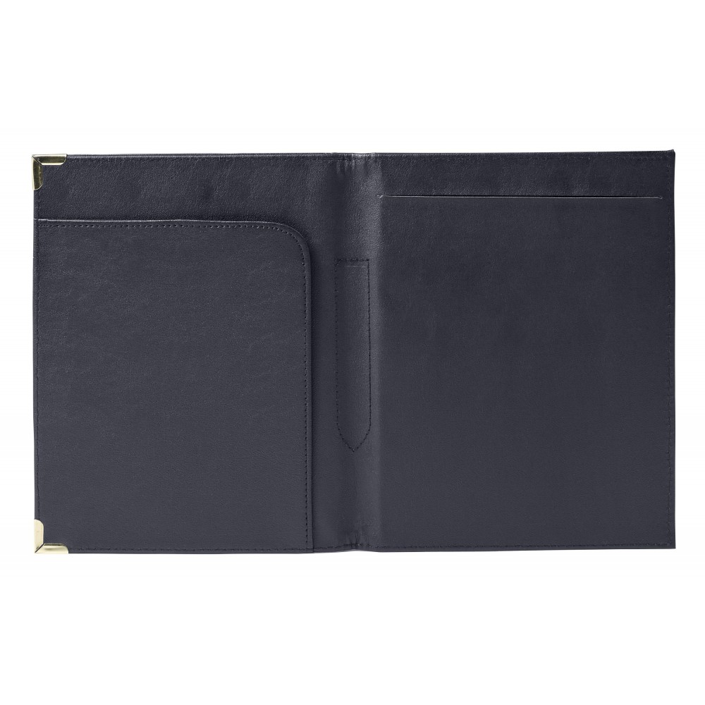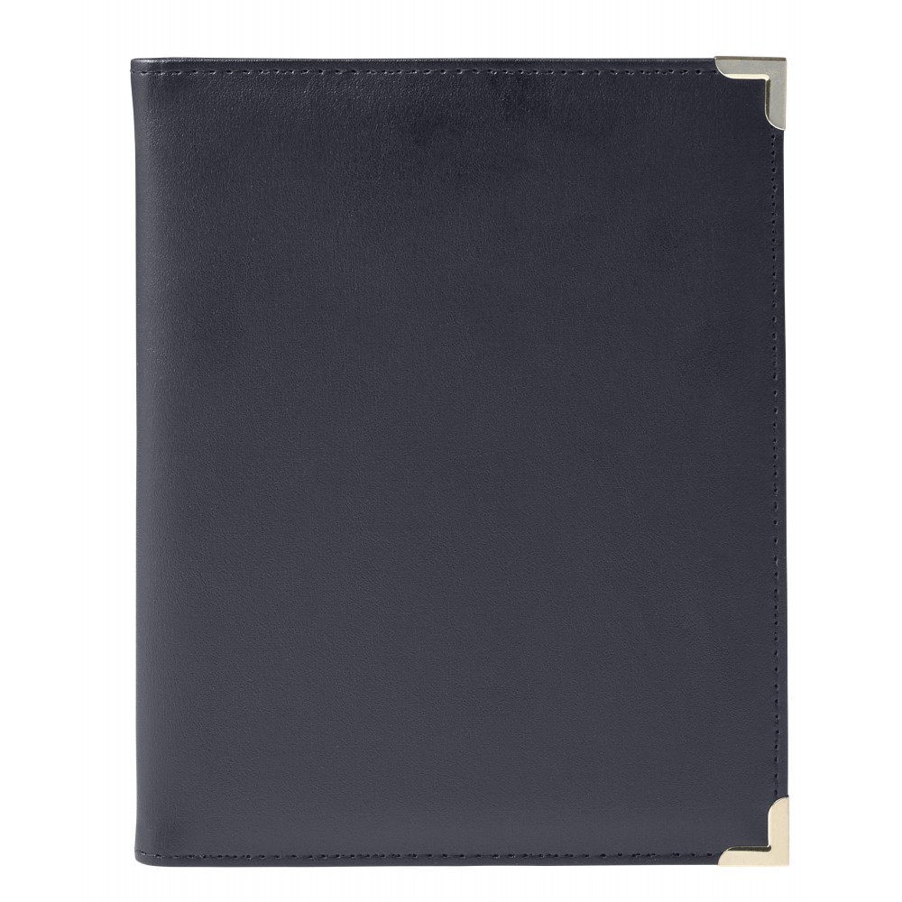 A5-ös PU mappa fém sarokkal. Jegyzettömböt nem tartalmaz. 30 vagy 50 lapos jegyzettömb fehér lapokkal a 23023 vagy 23026 cikkszámon külön rendelhető. A fekete mappa arany színű sarkokkal, a kék mappa ezüst színű sarkokkal érkezik.