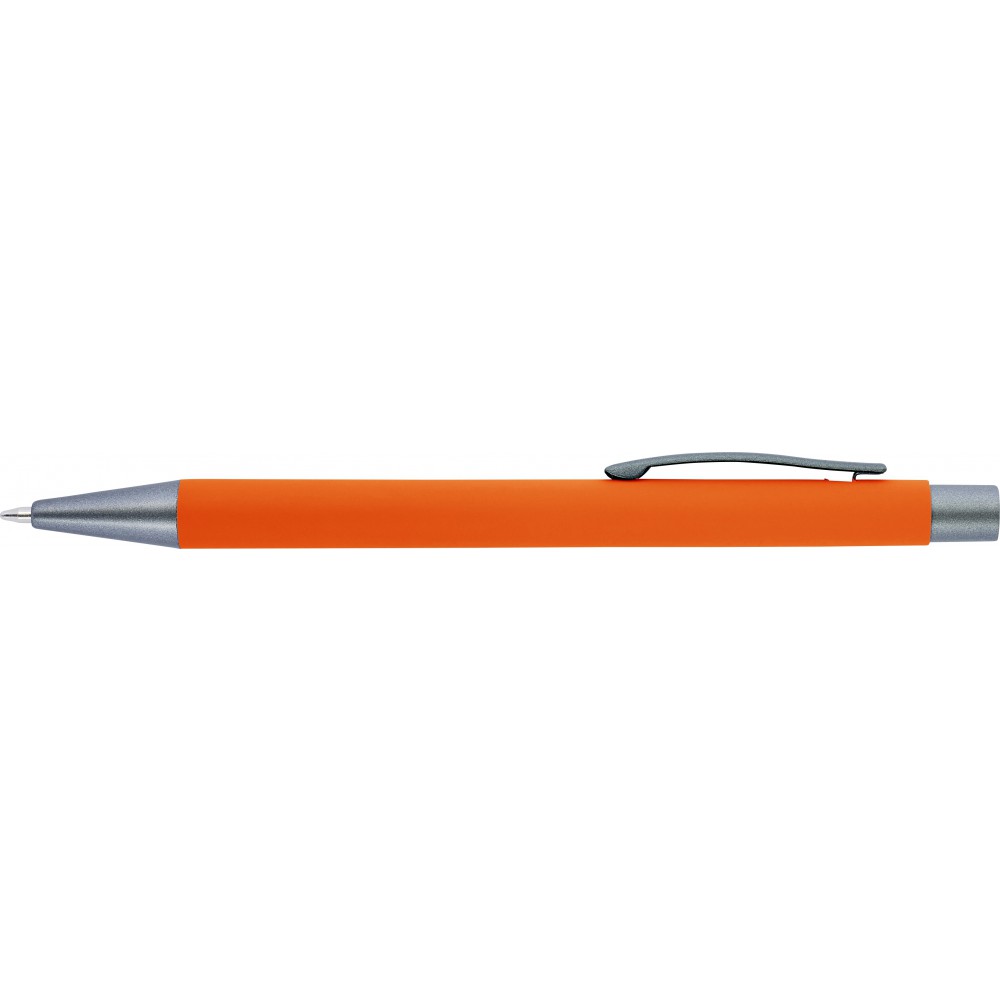 Golyóstoll gumis bevonattal, kék tollbetéttel. A hegy, klipsz és a nyomógomb egyforma sötétszürke színű. ABS, alumínium.