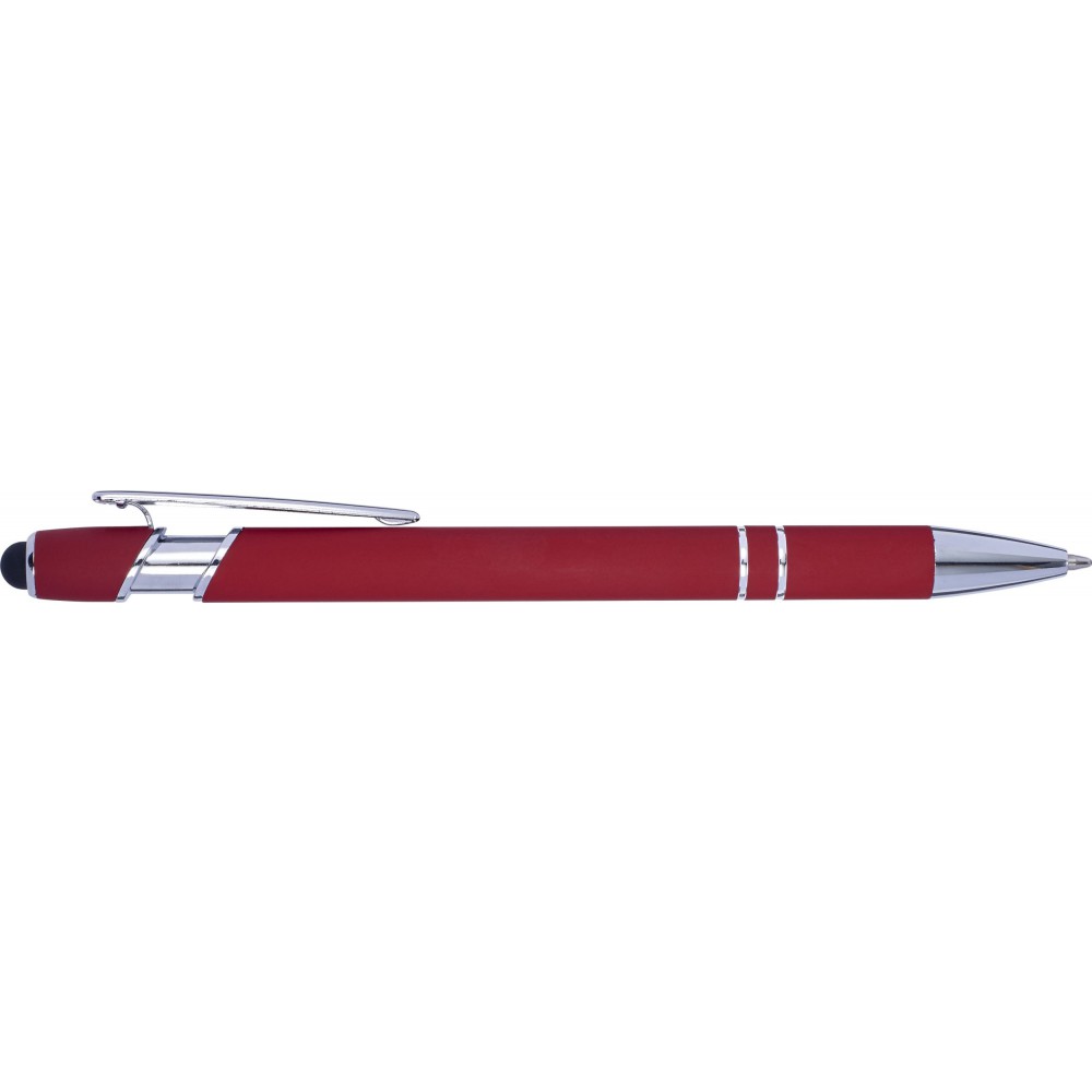 Golyóstoll kék tollbetéttel, gumis felülettel és érintővel kapacitív képernyőkhöz. Kék tollbetéttel. A hegy és a klipsz ezüst színű műanyag. ABS, alumínium.