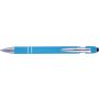 Golyóstoll kék tollbetéttel, gumis felülettel és érintővel kapacitív képernyőkhöz. Kék tollbetéttel. A hegy és a klipsz ezüst színű műanyag. ABS, alumínium.
