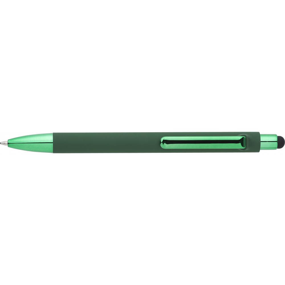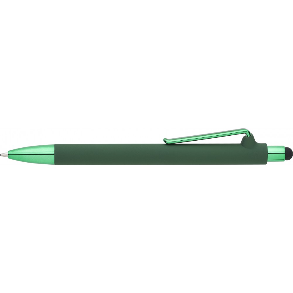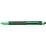 Golyóstoll gumis bevonattal és UV színű részletekkel, érintővel, kék tollbetéttel. ABS, PP műanyag, szilikon, vas.