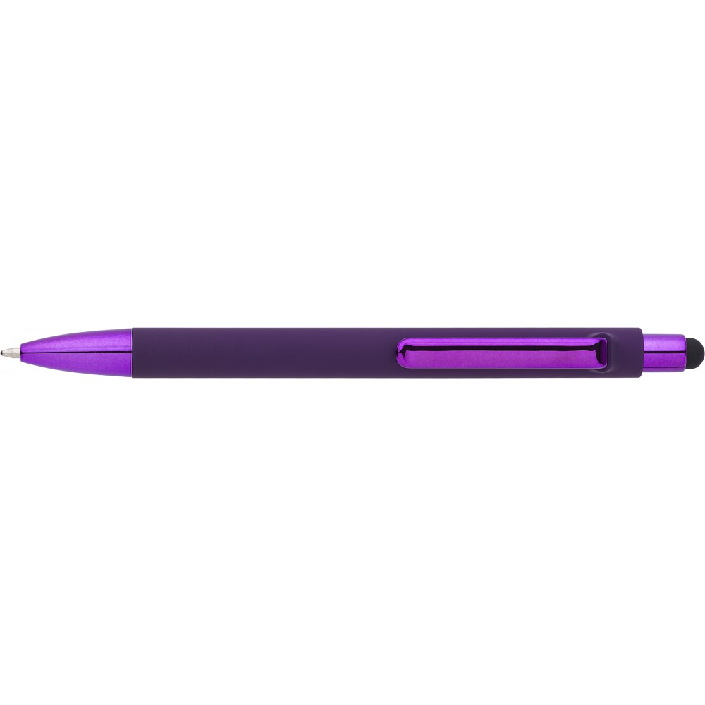 Golyóstoll gumis bevonattal és UV színű részletekkel, érintővel, kék tollbetéttel. ABS, PP műanyag, szilikon, vas.