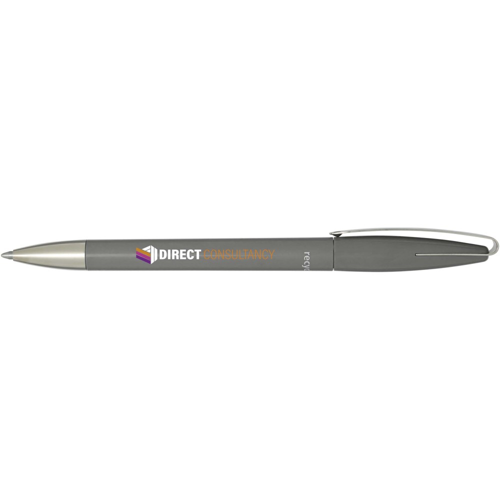 Golyóstoll, amelynek teste és klipsze újrahasznosított műanyagból, hegye pedig rozsdamentes acélból készült. Kék tollbetéttel. Íráshossz: 3000 méter. Hegyméret: 1,00 mm. Németországban készült.