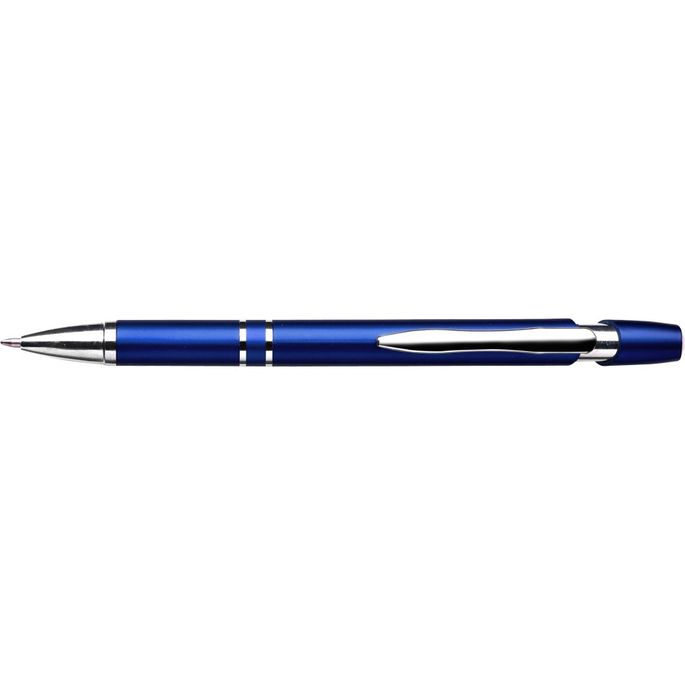 Műanyag golyóstoll metálos fényű tolltesttel, króm kiegészítőkkel, kék tollbetéttel.