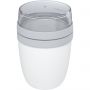 Ételtartó edény két rekesszel. Mindkét tartálynak külön fedele van. A felső, átlátszó rész űrtartalma 200 ml. Az alsó edény 500 ml-es. Fagyasztóba, mikrohullámú sütőbe (fedél nélkül), és mosogatógépbe tehető. A felső, átlátszó rész nem tehető mikrohullámú sütőbe. Szivárgásmentes. BPA mentes. PP műanyag, PCTG műanyag.
