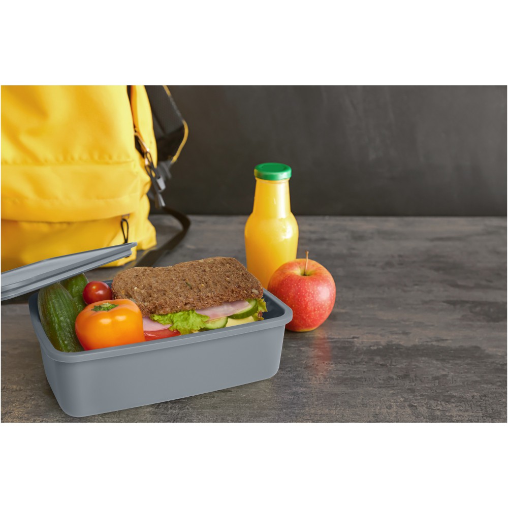 A 800 ml-es Dovi ebéddoboz 100%-ban újrahasznosított műanyagból készült, így fenntartható és trendi választás. Elasztikus szalaggal záródik, amely biztonságosan a helyén tartja a fedelet útközben.