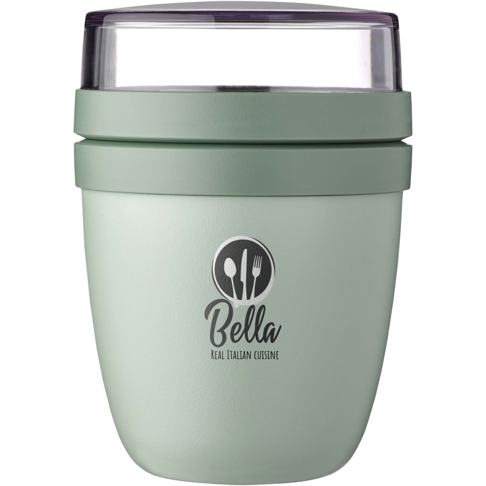 Az Ellipse Mini ételdoboz tökéletes különféle snackekhez, például joghurthoz müzlivel vagy leveshez krutonnal. Két praktikus rekesszel rendelkezik egy strapabíró tartályban, így az összetevőket szépen elkülönítheti egymástól. Kompakt mérete miatt ideális iskolatáskába való elhelyezésre, így gyors és kényelmes étkezést biztosít. A felső átlátszó tartály 120 ml-es, ideális körülbelül 50 gramm müzli vagy gyümölcs tárolására, az alsó tartály pedig 300 ml-es. Szivárgásmentes és mosogatógépben mosható. BPA-mentes.