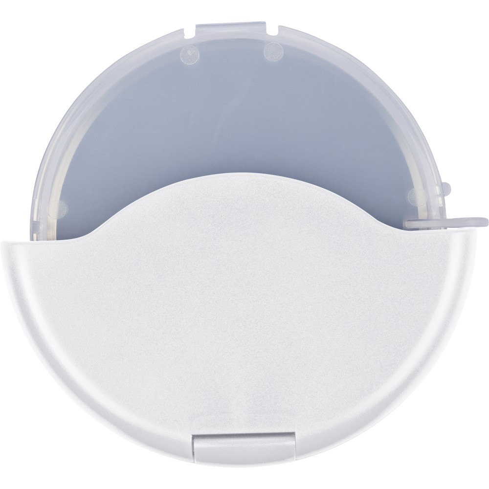 ABS és PP anyagból készült pizzavágó 430-as rozsdamentes acél pengével, kivehető védőborítással, amely könnyen felpattintható a tisztítás és a penge elérése érdekében. Újrahasznosított polietilén tasakba csomagolva.