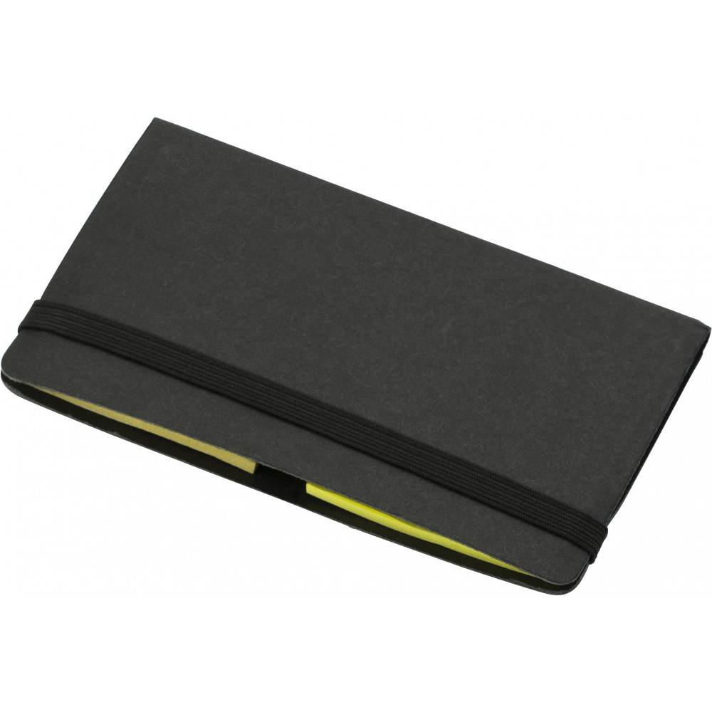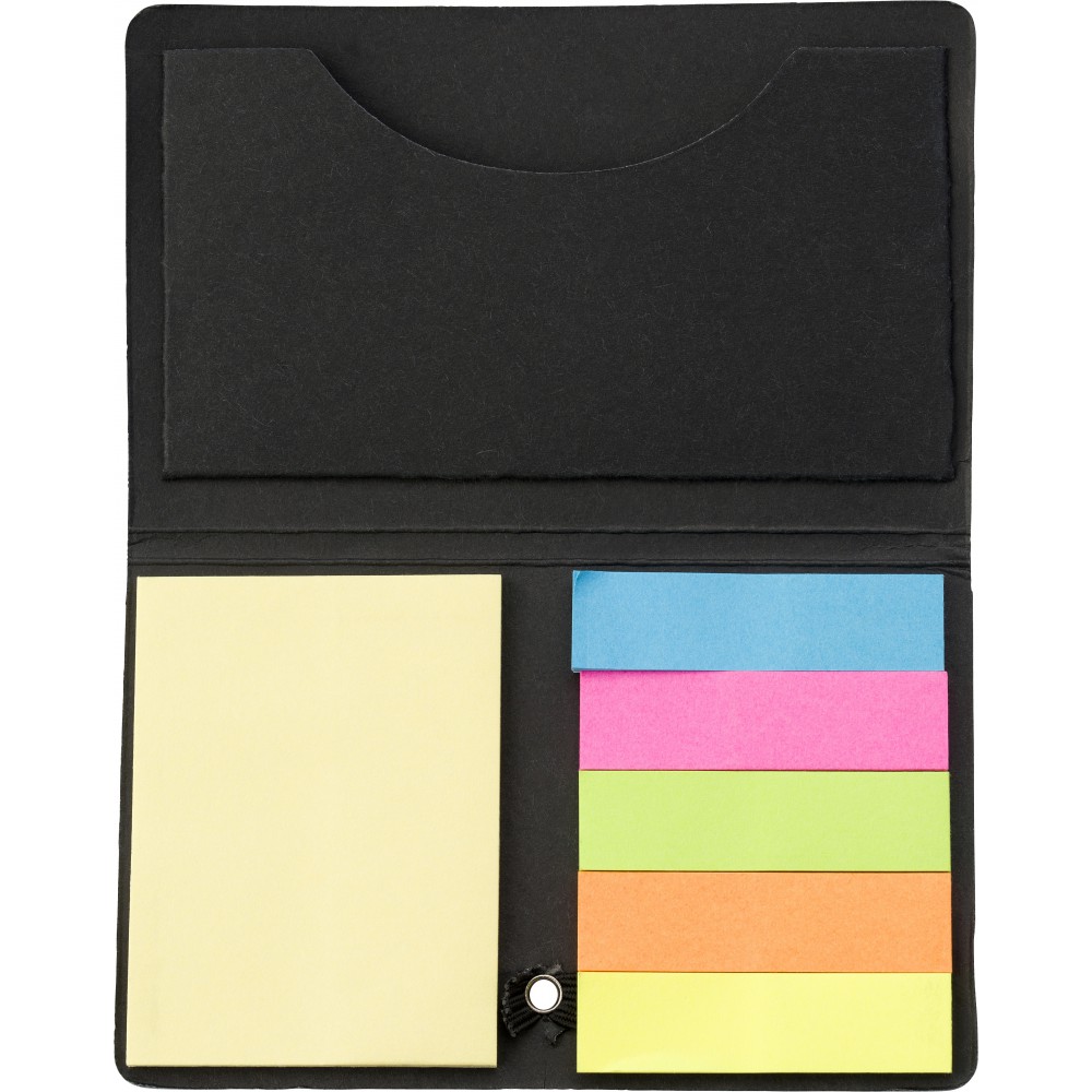 Jegyzettömbkészlet. Karton tartó összefogó pánttal, mely 150 öntapadó jegyzetlapot, valamint névjegyek tárolására alkalmas zsebet tartalmaz.