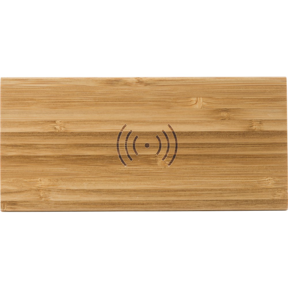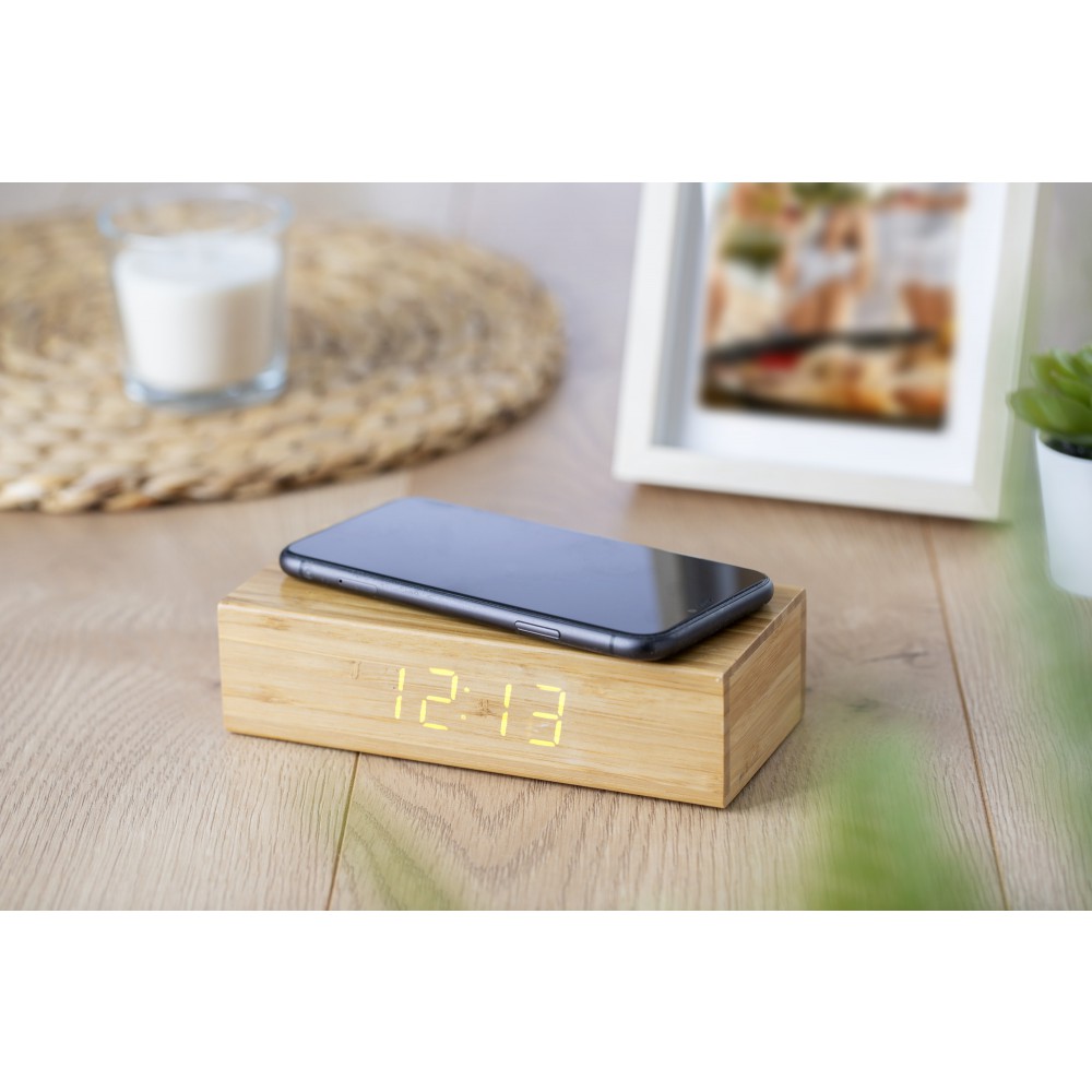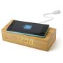 Bambusz vezeték nélküli töltő, 5W teljesítménnyel, beépített LED órával, fehér fénnyel, micro USB csatlakozóval. Az alján található gombokkal állítható be a pontos idő. A vezetéket és az elemet tartalmazza.