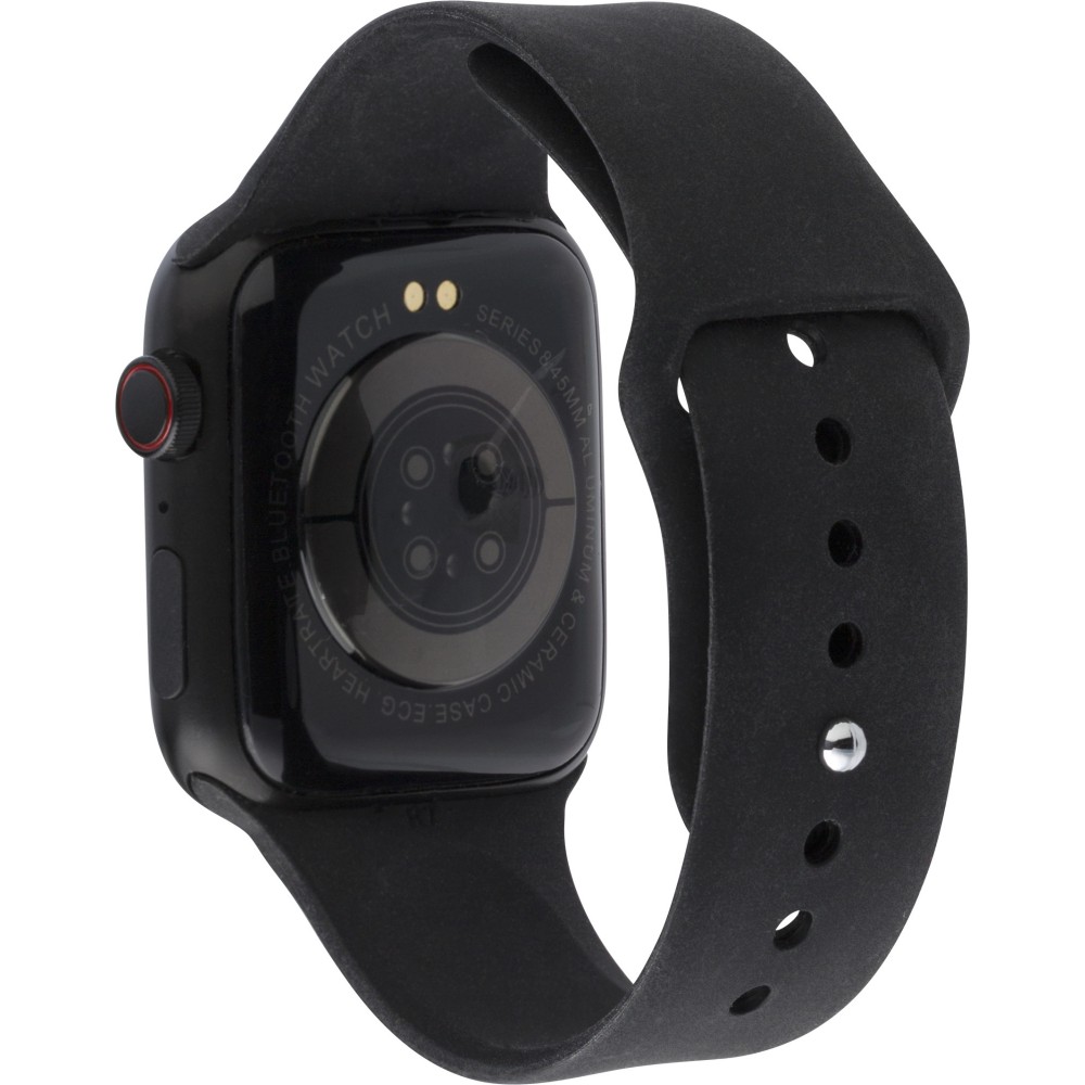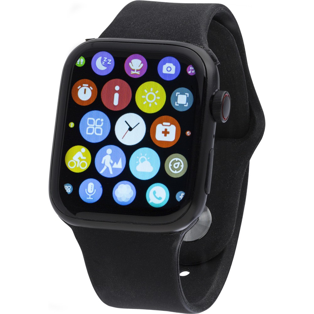 PC és PVC okosóra állítható karpánttal és vezeték nélküli technológiával. Érintőképernyővel és görgető gombbal az oldalán. Funkciók: telefonhívás, szívritmus, alvásfigyelő, oxigénmérés, üzenet emlékeztető, ivás emlékeztető, edzés emlékeztető. USB kábellel együtt. Egyenként csomagolva kartondobozban.