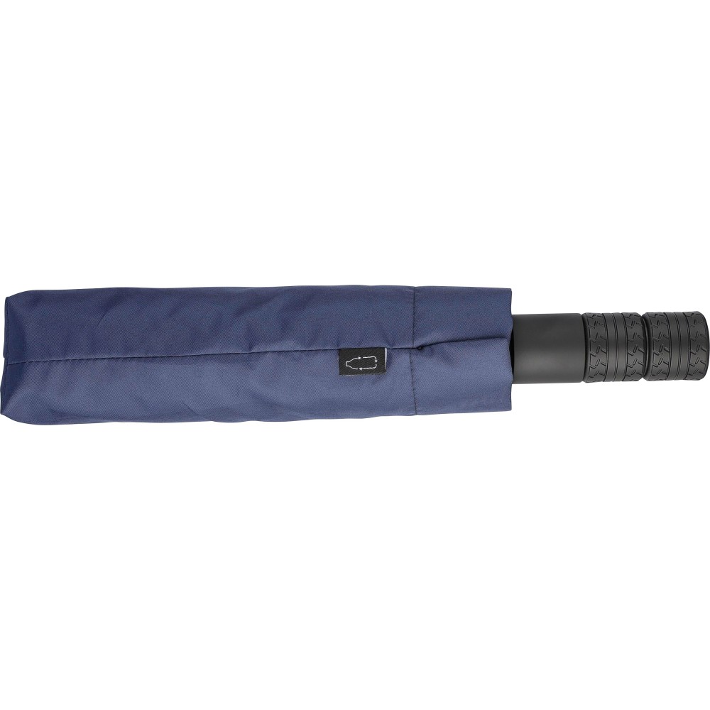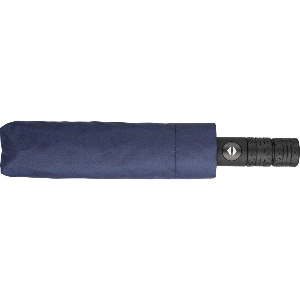 Automata nyitású és zárású, összecsukható esernyő 8 panellel, tokkal. Nyele gumis mintázatú, az autók abroncsára emlékeztet. Vászna RPET pongee anyag. Mérete: 21".