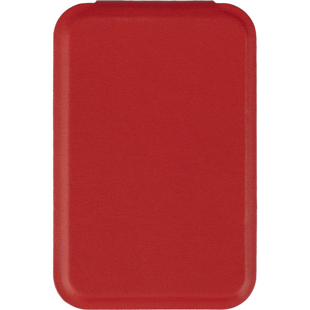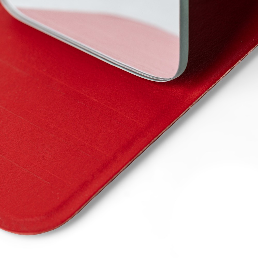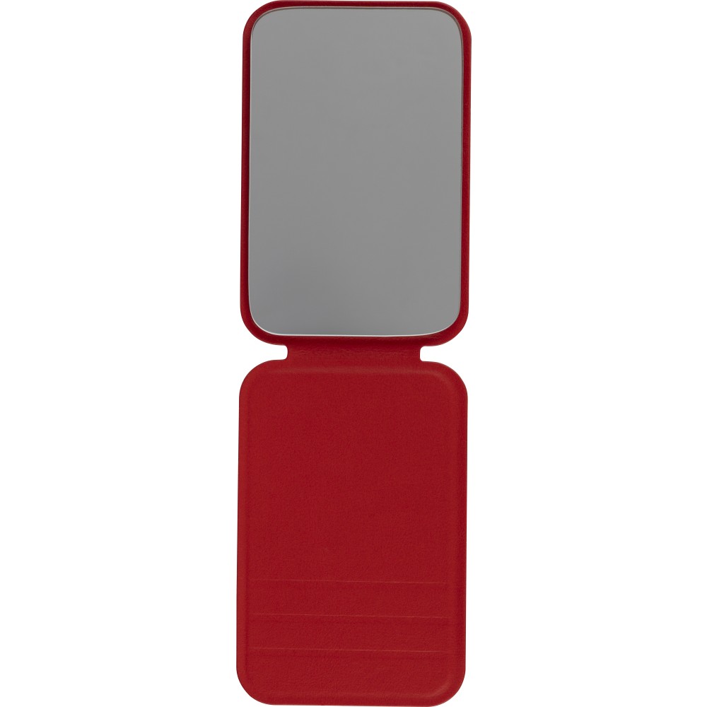 Üvegtükör összehajtható, újrahasznosított PU borítással, amely kinyitva álló helyzetben használható. A borításon dombornyomott, újrahasznosított alapanyagra utaló logó található. Papírtasakba csomagolva.