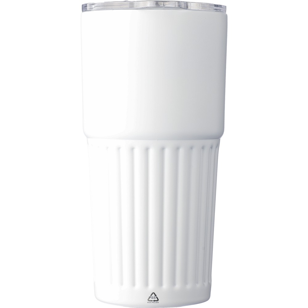 Újrahasznosított rozsdamentes acél útibögre, 450 ml. A belső 304-es, a külső 201-es rozsdamentes acélból készült, bordás markolattal, műanyag, csúszózáras fedéllel. Gravírozott újrahasznosított logó található a bögrén. Csomagolása barna papírdoboz.
