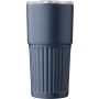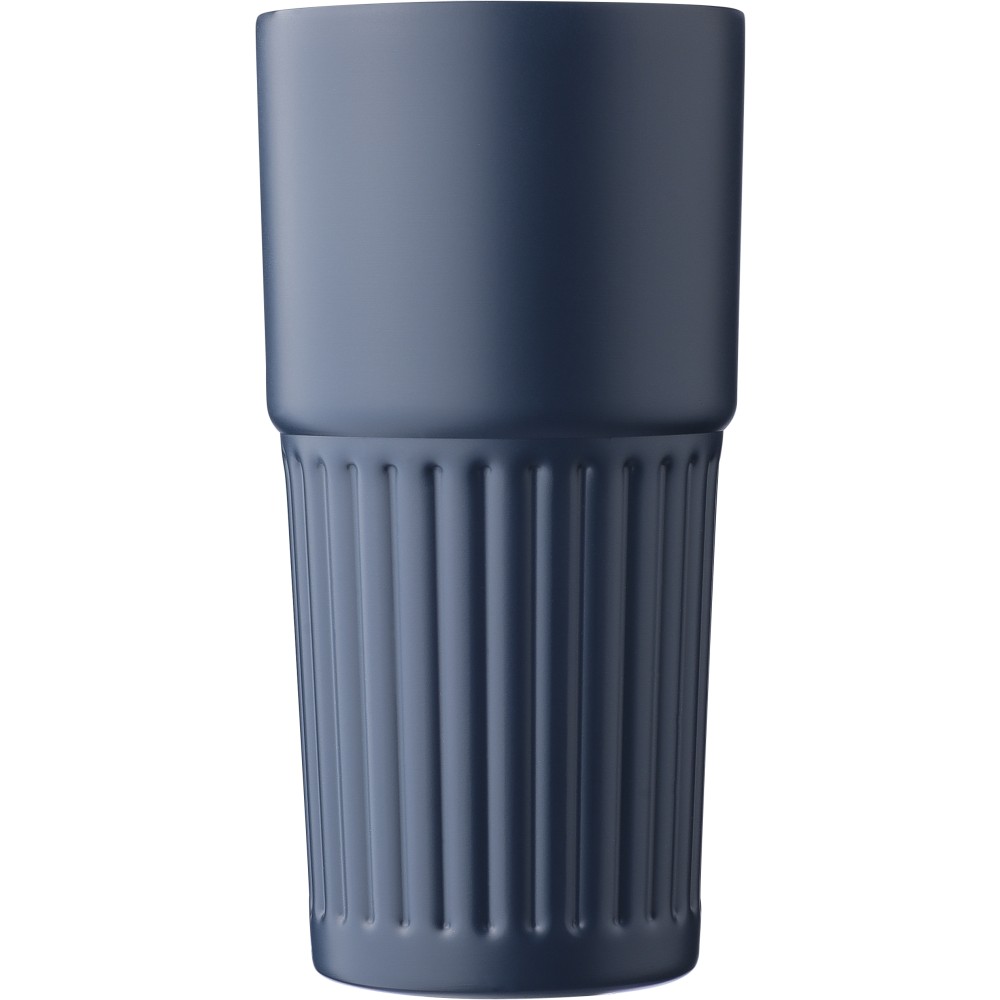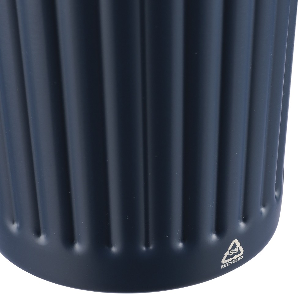 Újrahasznosított rozsdamentes acél útibögre, 450 ml. A belső 304-es, a külső 201-es rozsdamentes acélból készült, bordás markolattal, műanyag, csúszózáras fedéllel. Gravírozott újrahasznosított logó található a bögrén. Csomagolása barna papírdoboz.