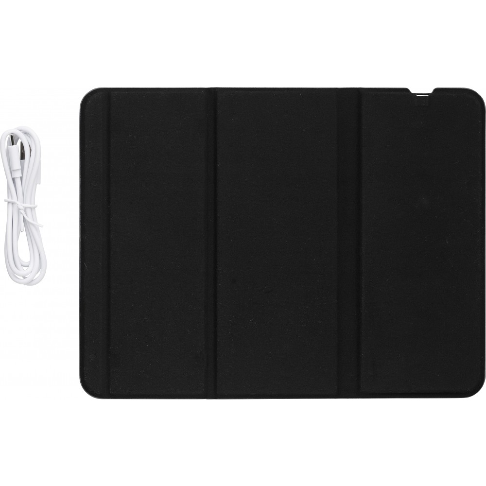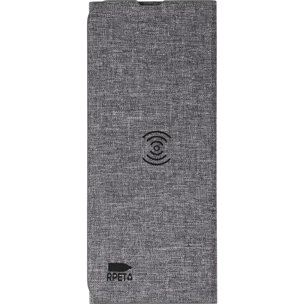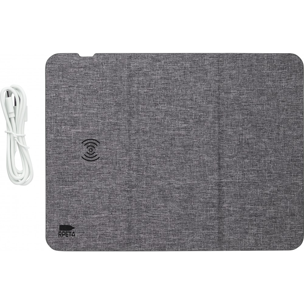 10 W-os vezeték nélküli gyorstöltő és egéralátét RPET szövet borítással. Töltéshez telefonállvánnyá is összehajtható. Lapos állapotban töltőként és egéralátétként is használható. Darabonként barna kartondobozba csomagolva érkezik. Az RPET anyagra utaló, nyomtatott logó gyárilag látható az egéralátéten.