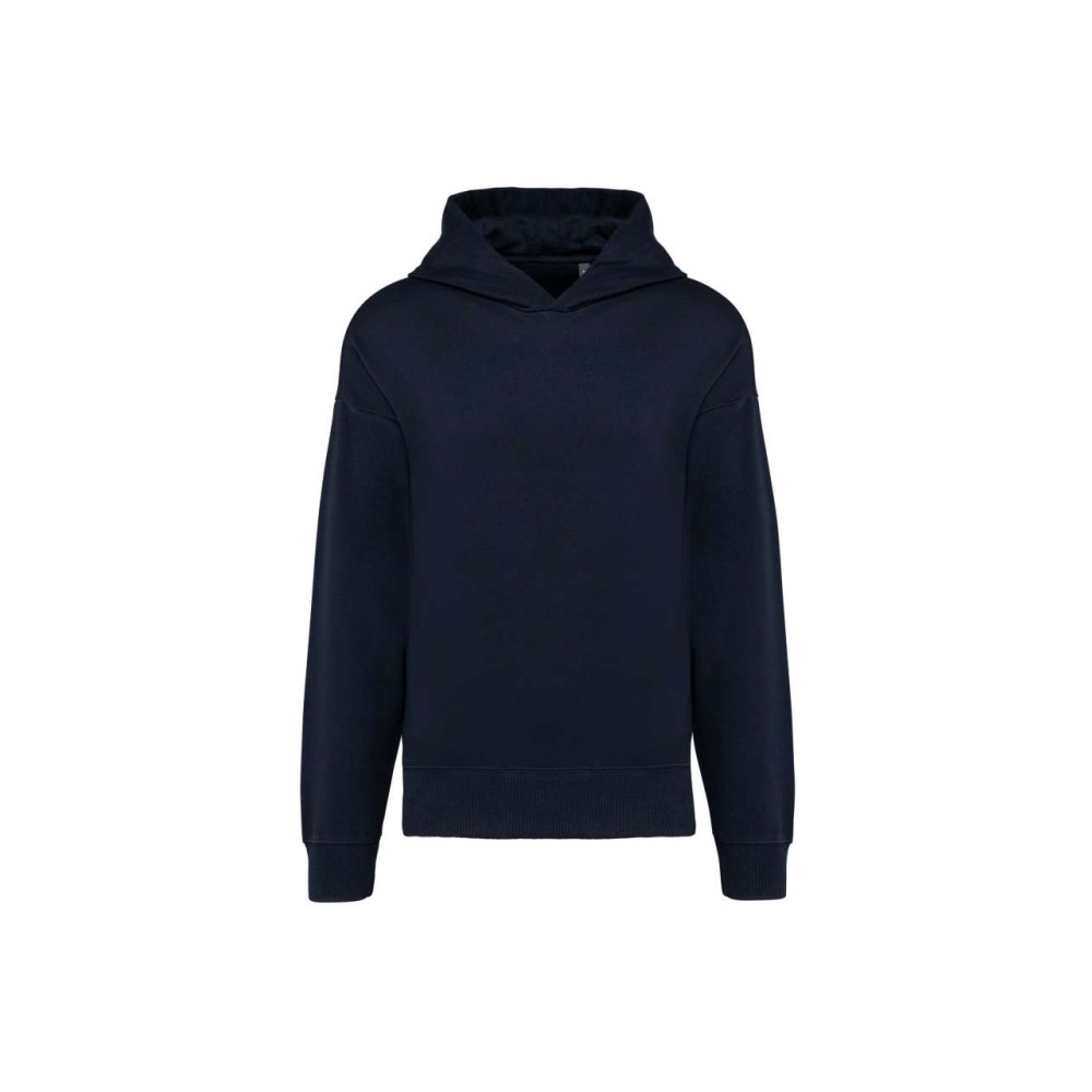 80% cotton / 20% polyester. Oversized fit with dropped shoulders. Brushed fleece. Carded cotton. 1x1 ribbing with a tubular finish on the cuffs and hem. Hidden pocket with invisible zip in the seam on the right side when worn. Cotton hood with double dart. Elastane in the ribbing on the cuffs and at the bottom of the garment to prevent them from going out of shape. Matching twill taped neck. Half-moon finish inside neck. Double overlaid overstitching on cuffs and bottom hem. No brand label on the collar. only a size tag for easy decoration.