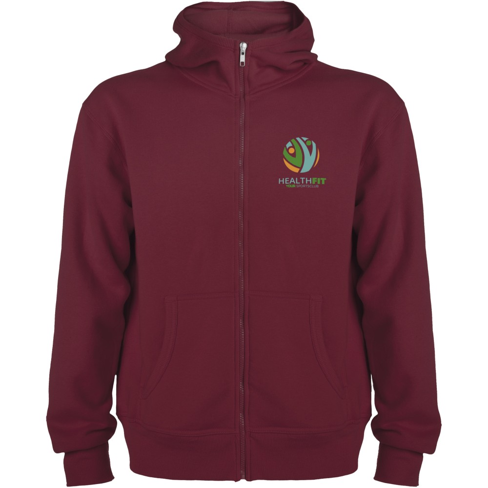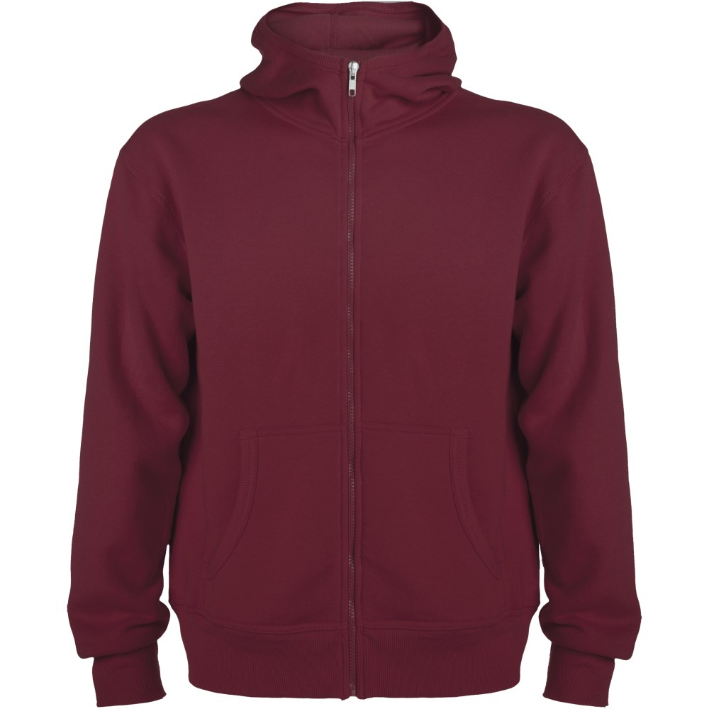 Magasnyakú, kapucnis pulóver teljes cipzárral. Bordázott részletek a kapucni és a zsebek szélén. Kenguru stílusú zseb. 2x2-es bordás kézelő és nyakpasszé. Gyerekméretekben is kapható. 50% pamut és 50% poliészter, 280 g/m2.