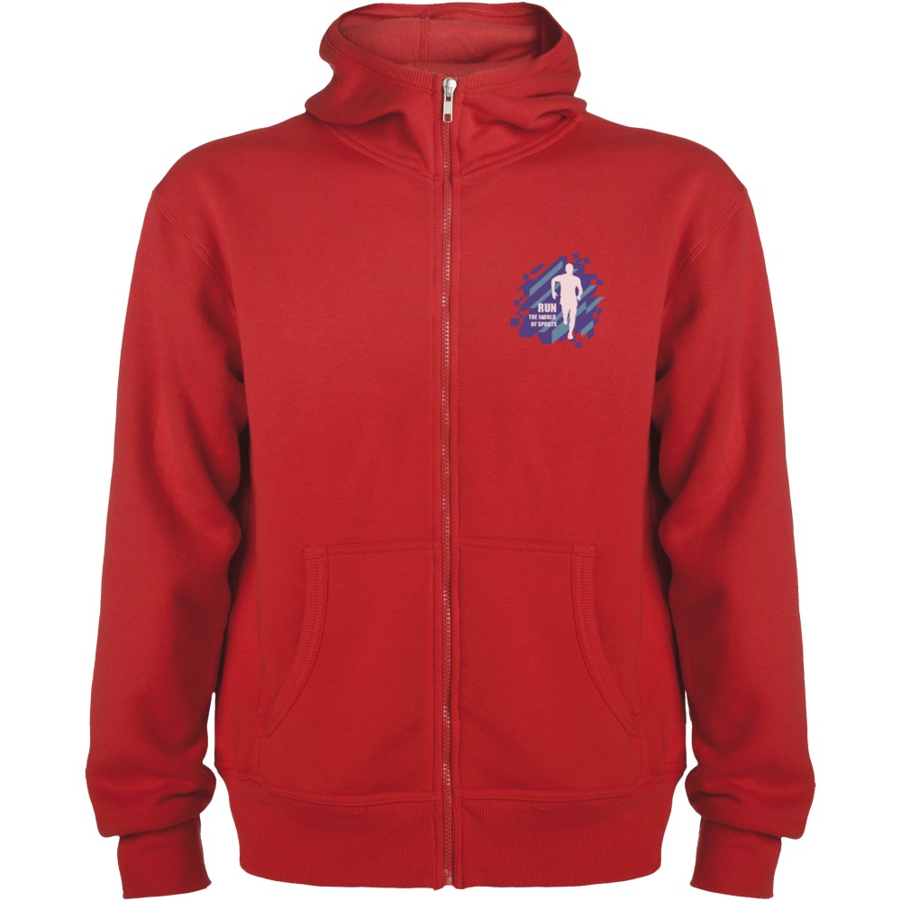 Magasnyakú, kapucnis pulóver teljes cipzárral. Bordázott részletek a kapucni és a zsebek szélén. Kenguru stílusú zseb. 2x2-es bordás kézelő és nyakpasszé. Gyerekméretekben is kapható. 50% pamut és 50% poliészter, 280 g/m2.