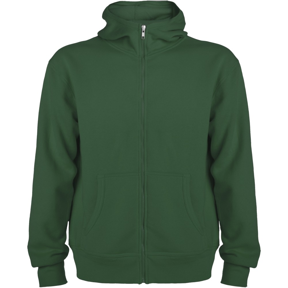 Magasnyakú, kapucnis pulóver teljes cipzárral. Bordázott részletek a kapucni és a zsebek szélén. Kenguru stílusú zseb. 2x2-es bordás kézelő és nyakpasszé. Gyerekméretekben is kapható. 50% pamut és 50% poliészter, 280 g/m2.