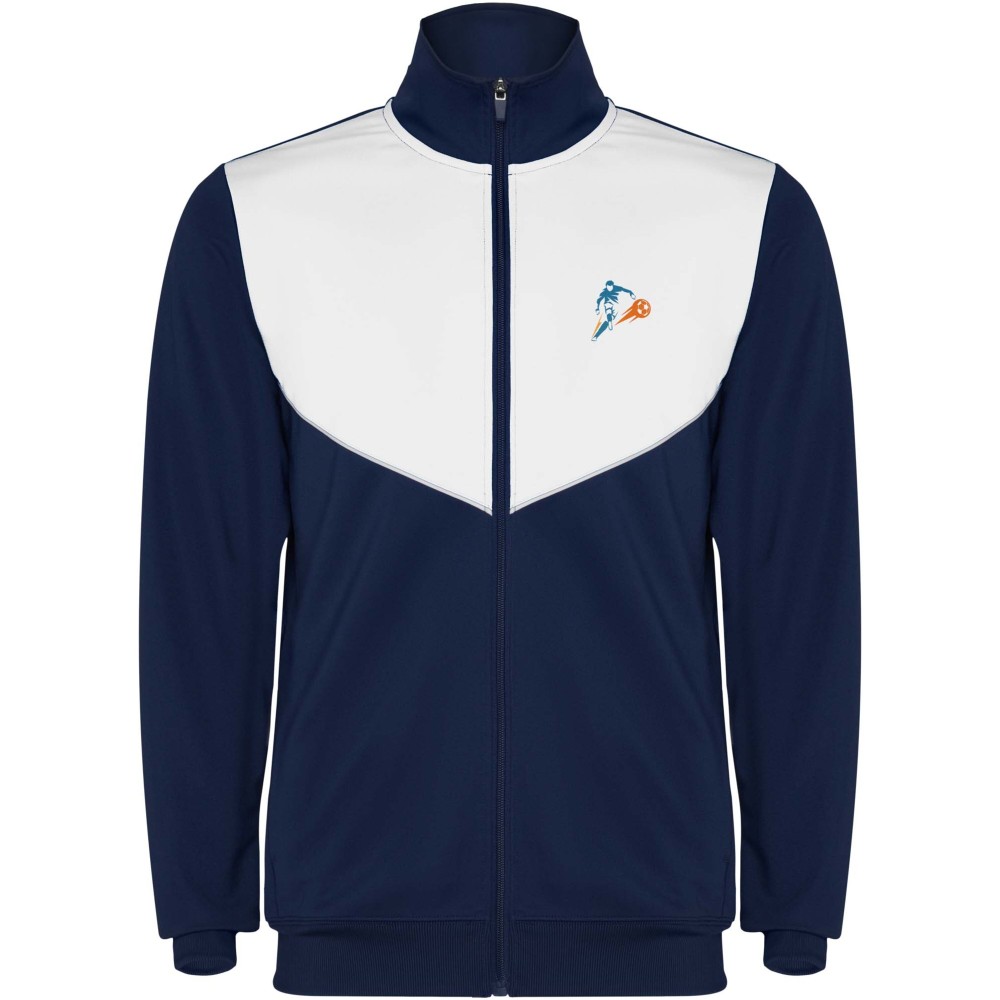 Könnyű és rugalmas anyagból készült melegítő. A végig cipzáros felső kontrasztos színű és varrású díszítésekkel dekorált a mellrészen. Oldalzsebek. Bordázott ujj- és és derékpasszé. Nadrág gumis derékkal és húzózsinórral, kontrasztos oldalsó varrással. Cipzáras szegély.