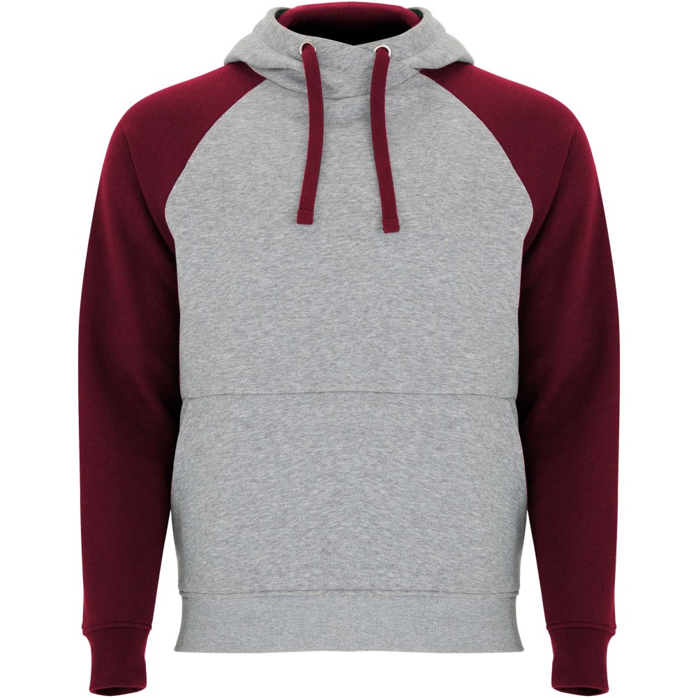 Két színű uniszex kapucnis pulóver. Kapucni keresztezett nyakrésszel és fém kiegészítőkkel. Kontrasztos belső rész a kapucnin, húzózsinór és raglán ujjak. Kenguru zseb. Rugalmas 1x1 passzék és alj. Levehető címke.