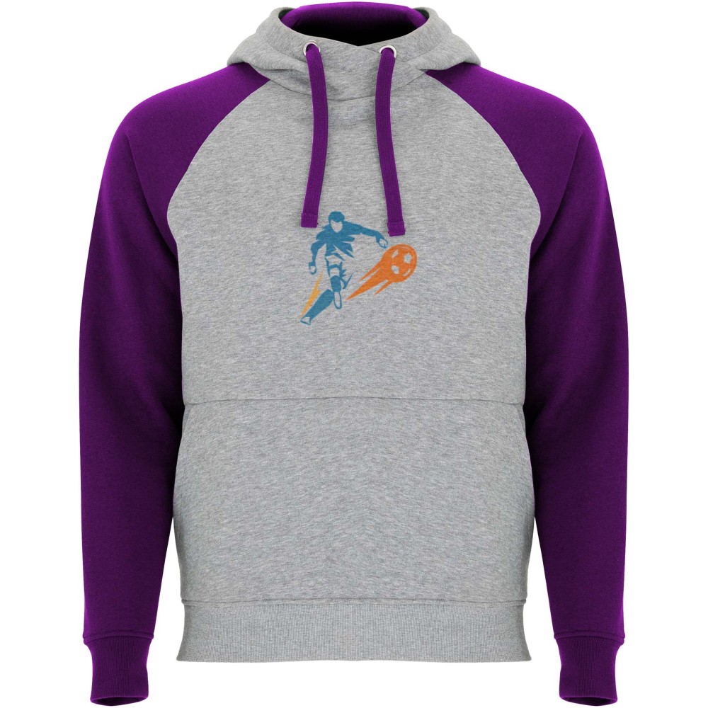 Két színű uniszex kapucnis pulóver. Kapucni keresztezett nyakrésszel és fém kiegészítőkkel. Kontrasztos belső rész a kapucnin, húzózsinór és raglán ujjak. Kenguru zseb. Rugalmas 1x1 passzék és alj. Levehető címke.