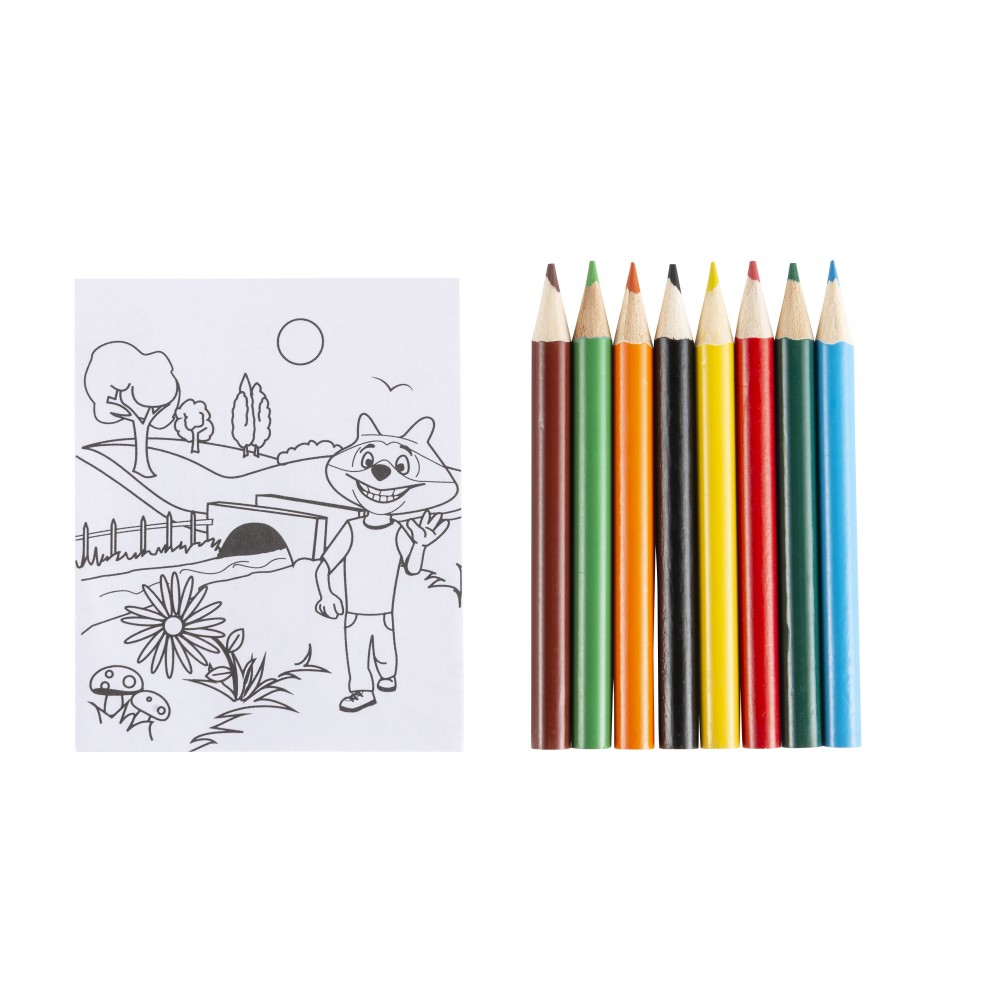 Színesceruza-készlet és kifestő 8 ceruzával és 20 színezőlappal átlátszó műanyag dobozban.