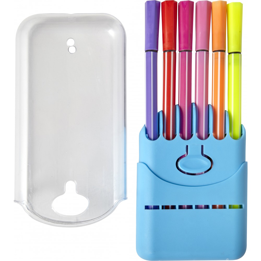 Filctollkészlet átlátszó műanyag dobozban, 12 db filctollal.