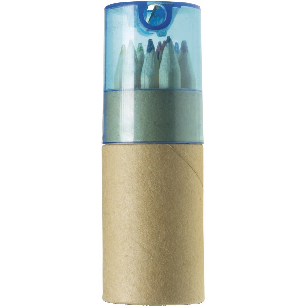 12 db-os színesceruza-készlet henger alakú papírdobozban, ceruzahegyezővel.