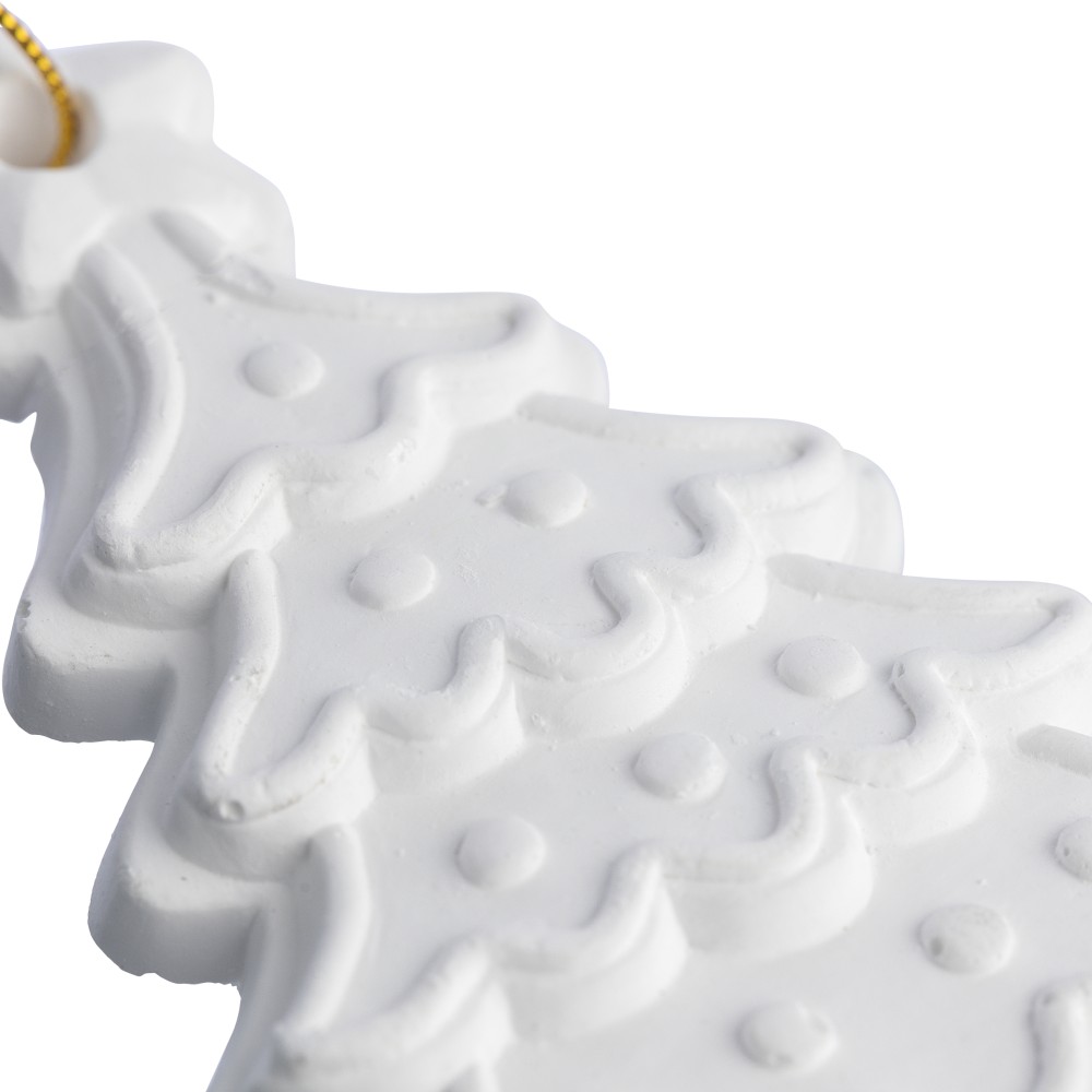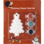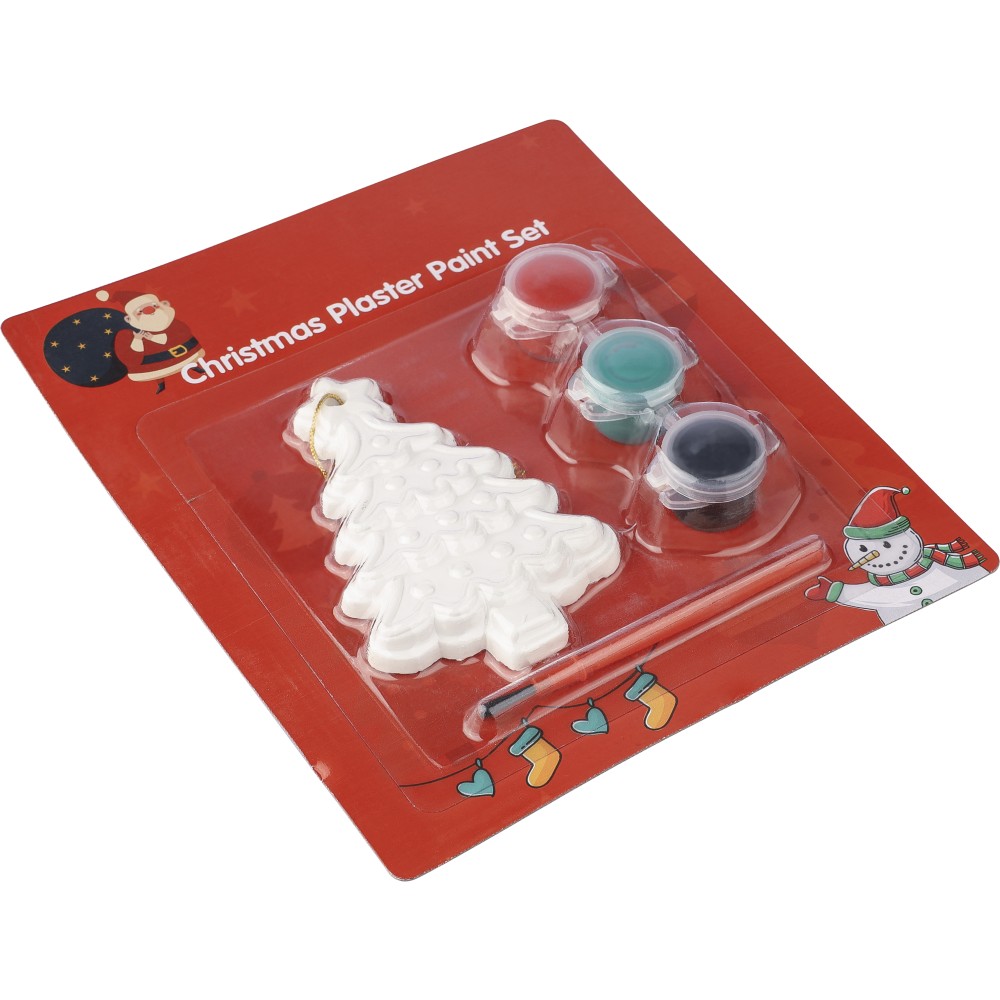Karácsonyfa festőkészlet, amely tartalmaz egy gipszfigurát, három különböző színű akrilfestéket és egy ecsetet. A figurát a rajta található lyukon keresztül poliészter zsinórral lehet karácsonyfadíszként felakasztani.