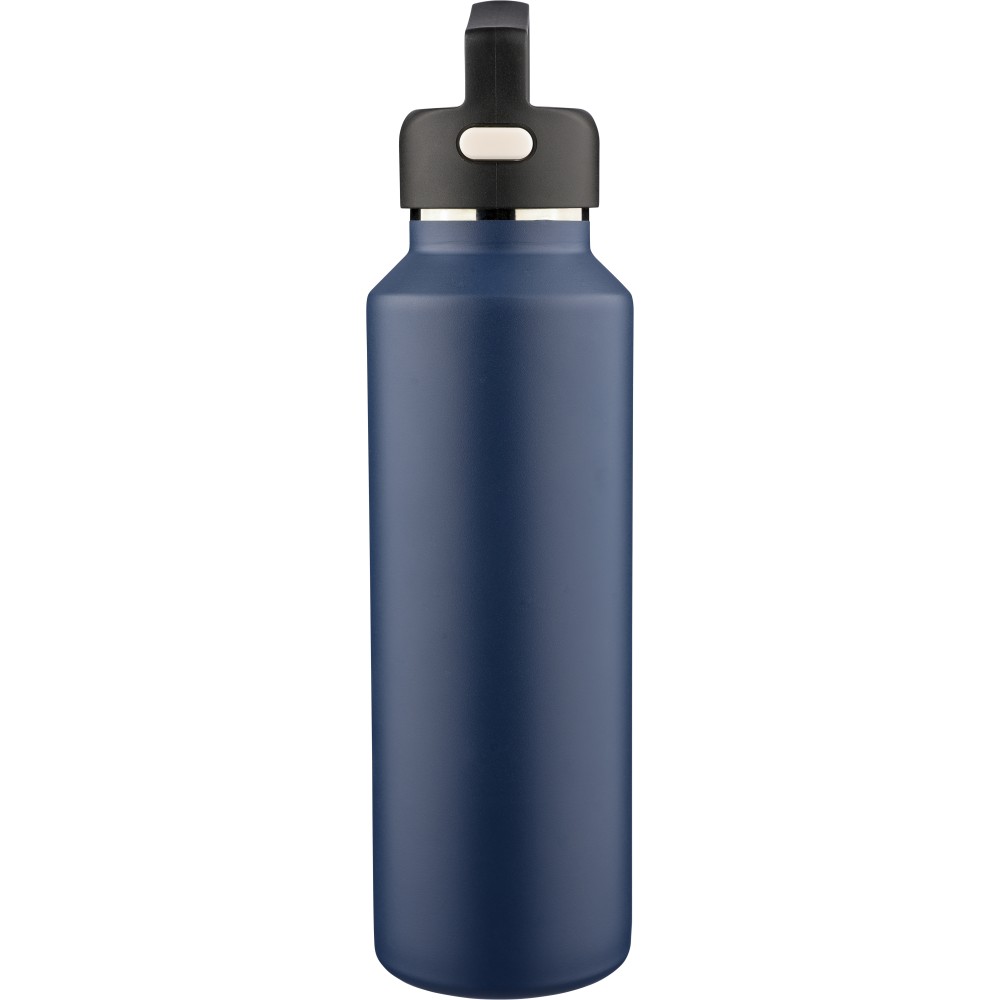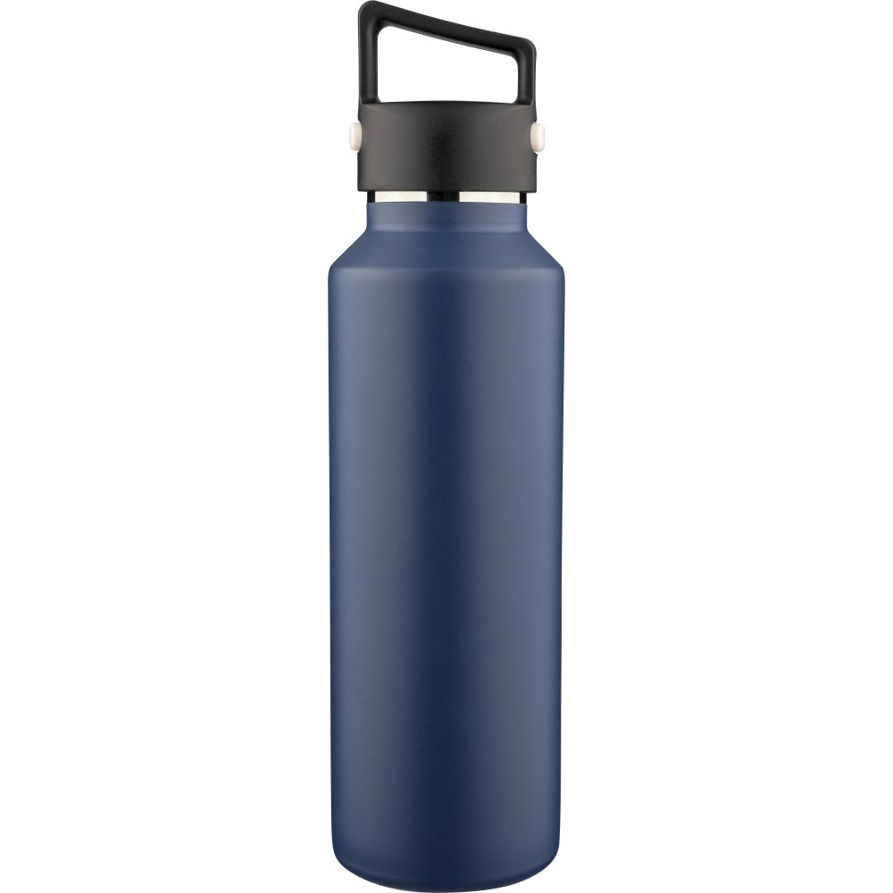 Újrahasznosított rozsdamentes acélból készült, vákuumszigetelésű palack 600 ml űrtartalommal, duplafalú kialakítással, hordozófüllel ellátott PP fedéllel és kétféle (dupla) nyitási lehetőséget biztosító nyomógombos rendszerrel. A palacktesten lézergravírozott recycled (újrahasznosított) alapanyagra utaló logó található. Darabonként barna kartondobozba csomagolva.