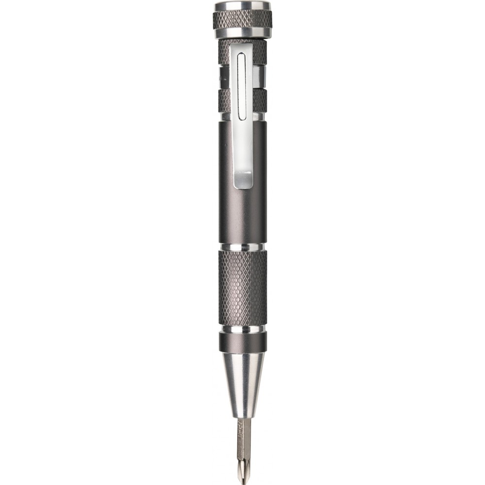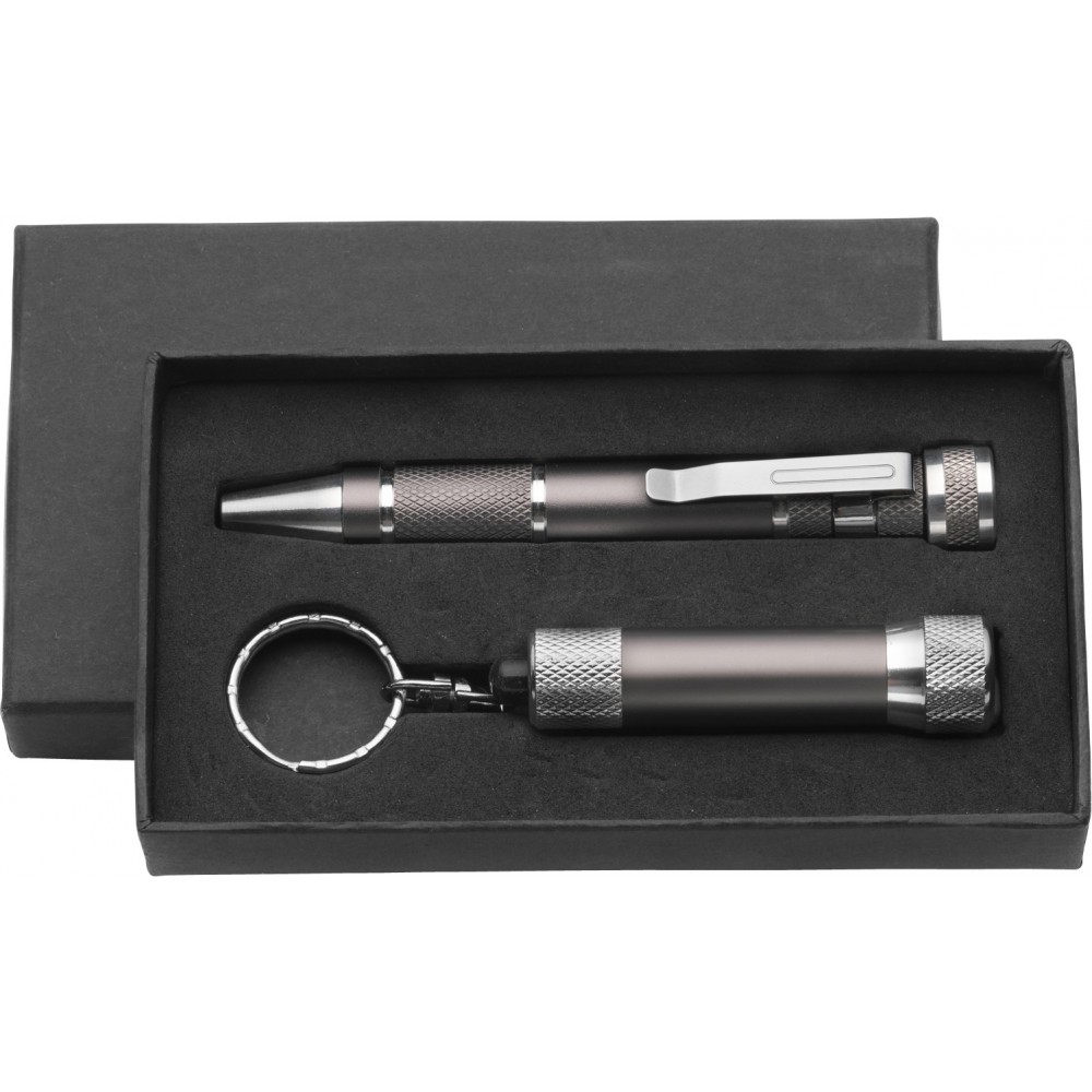 Szerszámkészlet. Tartalma: toll alakú csavarhúzó, 4 db sima csavarhúzó, 4 db csillagcsavarúzó fej, 3 LED-es zseblámpa és kulcstartó. Az elemet tartalmazza.