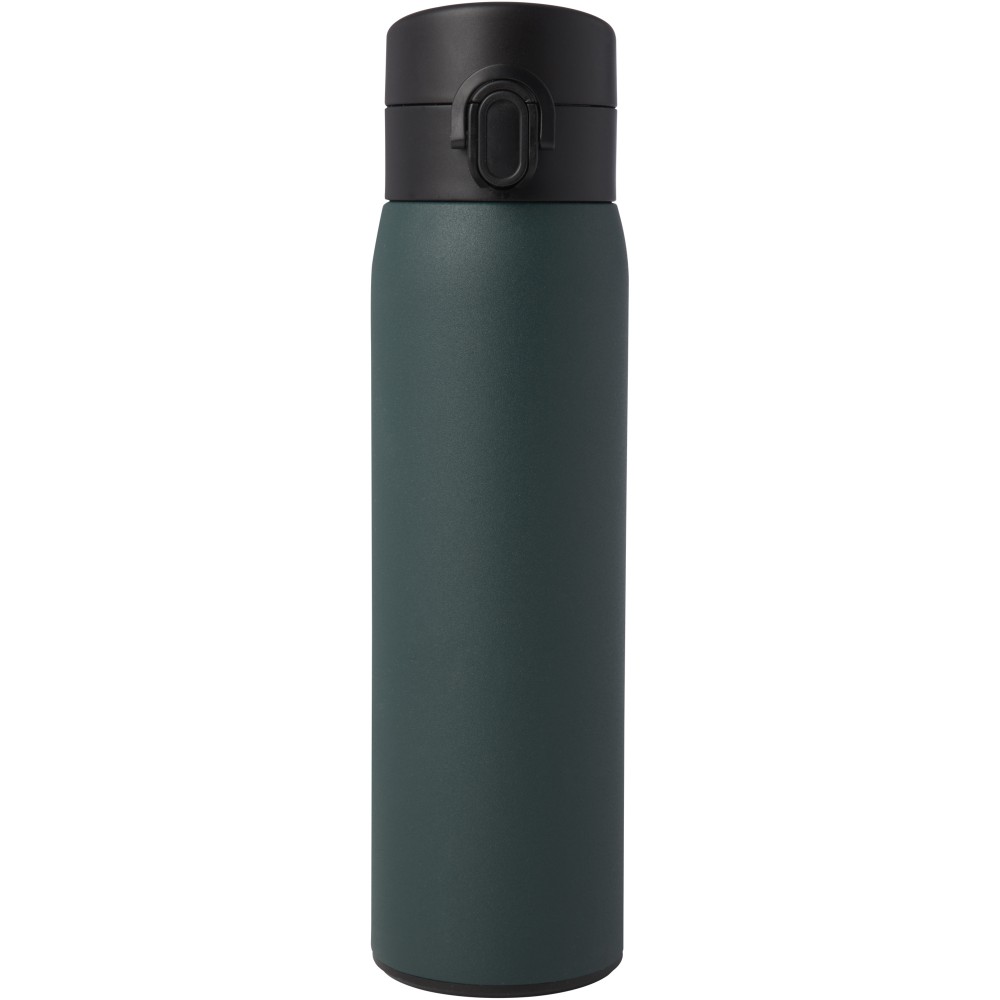 Stílusos, RCS tanúsítvánnyal rendelkező újrahasznosított rozsdamentes acélból készült, szigetelt palack gombos nyitómechanizmussal. A flaska szivárgásmentes és a réz vákuumszigetelésnek köszönhetően az italokat több órán keresztül forrón vagy hidegen tartja. Űrtartalom: 450 ml. Újrahasznosított kartonból készült díszdobozban szállítjuk.