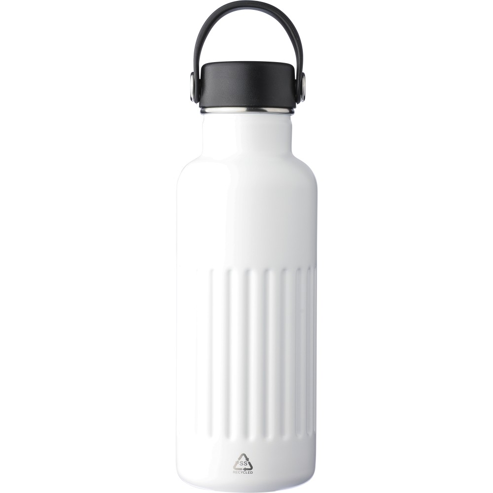 Újrahasznosított rozsdamentes acél termosz, 500 ml. A belső 304-es, a külső 201-es rozsdamentes acélból készült, bordás markolattal, PP és fém fedéllel, műanyag hordozófüllel. Gravírozott újrahasznosított logó található a terméken. Csomagolása barna papírdoboz.