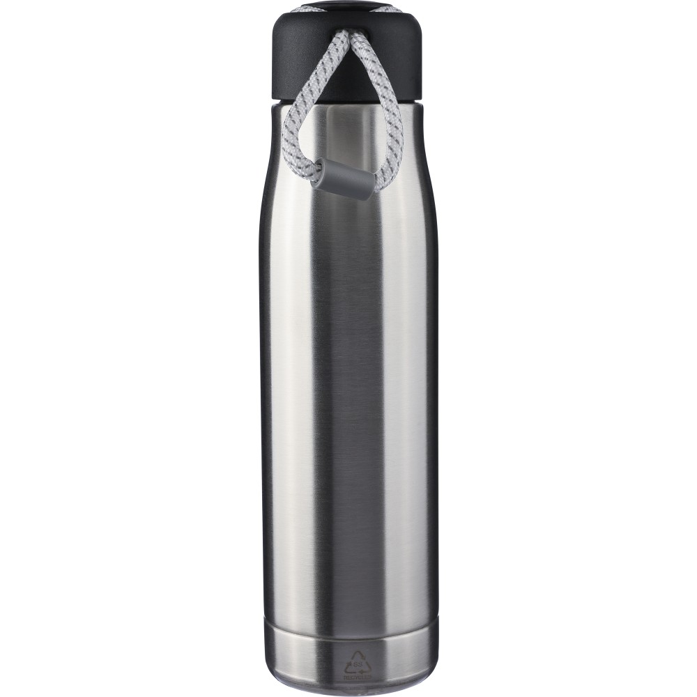 Újrahasznosított rozsdamentes acélból készült duplafalú, vákuumszigetelt termosz, 500 ml-es. Belseje 304-es, külseje 201-es rozsdamentes acél. Csavaros PP kupakkal, poliészter hordozópánttal. Hőszigetelésre és mindennapos használatra tervezve. Az újrahasznosított anyagra utaló gravírozott logóval. Csomagolása barna papírdoboz.
