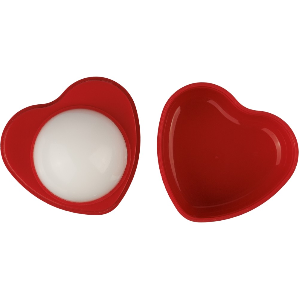 PP anyagból készült szív alakú tégely, benne 5,5 g vanília illatú ajakbalzsammal.