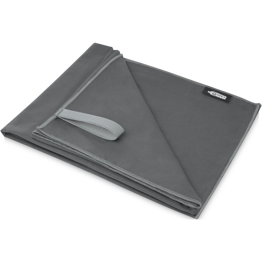 Ez a sporttörölköző nagyon jó nedvszívó, könnyű és gyorsan szárad. Ha a törölközőt összehajtjuk és gumiszalaggal rögzítjük, kis mérete miatt alkalmas edzőterembe, uszodába, vagy kempingezésre. A törölköző 130 x 80 cm méretű, 200 gr/m2-es újrahasznosított PET poliamidból készült, mosógépben 40°C-on mosható. Újrahasznosított PET műanyagból készült tároló tasakkal (20 x 8,5 cm) szállítjuk, amely remek helyet biztosít a logó nyomtatásához.