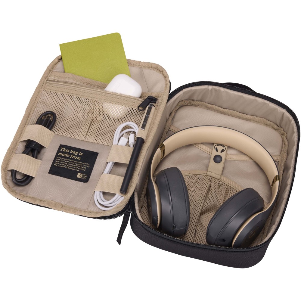 A Case Logic Invigo tartozéktáskában van hely a kábelek, fülhallgatók, adapterek és egyéb személyes tárgyak számára. Nagyszerűen használható egy nagyobb táskában vagy önmagában. Ez a táska 100%-ban újrahasznosított 600D poliészter külsővel és 150D poliészter béléssel készült. Tolltartó zsebbel, cipzáras zsebbel, egy nagy csúszózsebbel és külön tárolórekeszekkel rendelkezik a nagyobb tárgyak, például fejhallgatók számára.