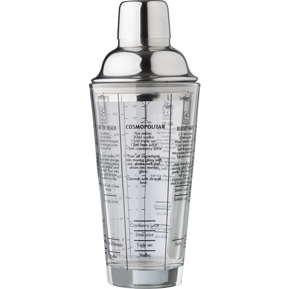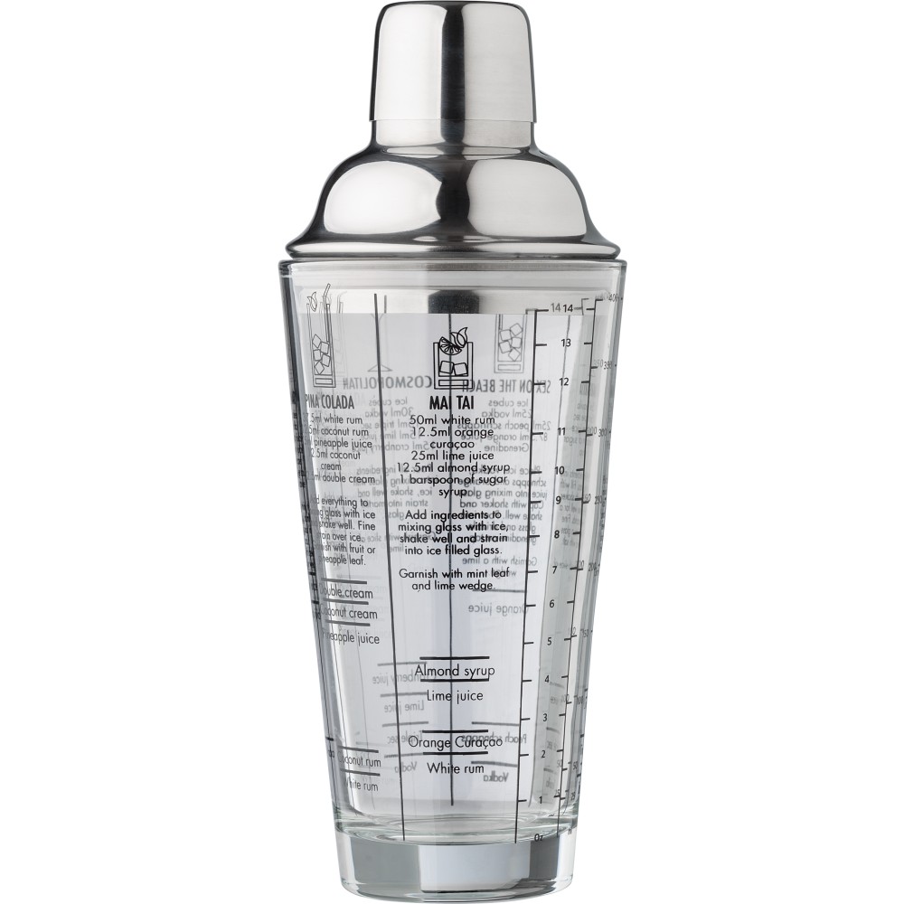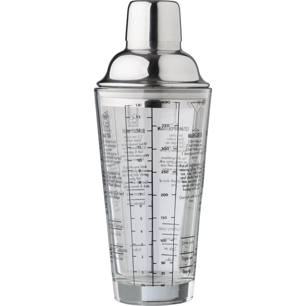 Üveg koktél shaker (400 ml) rozsdamentes acél (s/s304) fedéllel. Koktélreceptek találhatóak nyomtatva az oldalán. Egyedi csomagolásban, barna kartondobozban.
