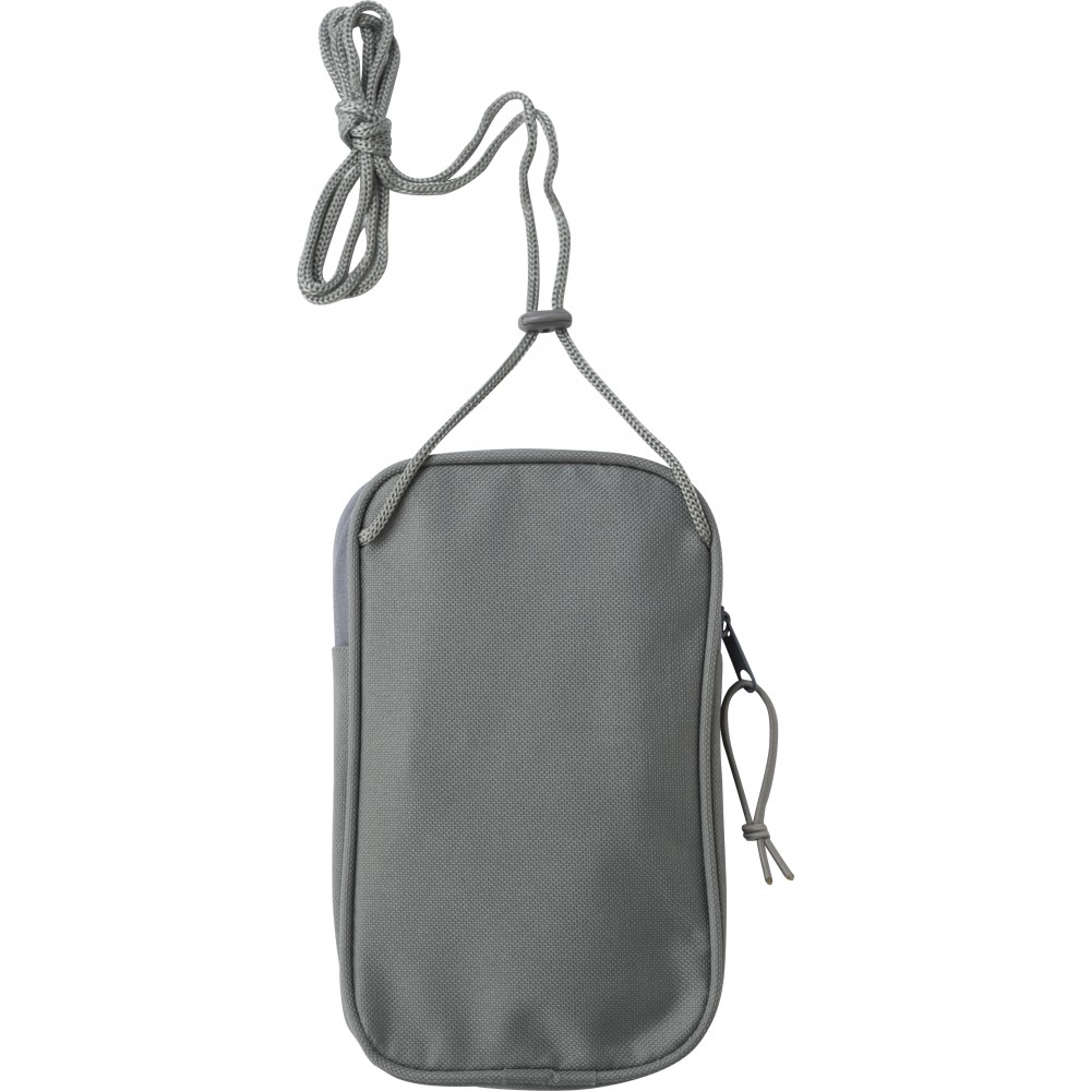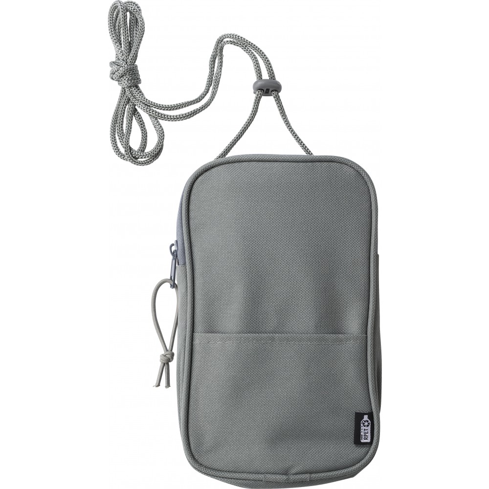 Nyakbaakasztható kistáska egy cipzáros résszel és egy nyitott zsebbel, állítható pánttal. 600D RPET anyag.