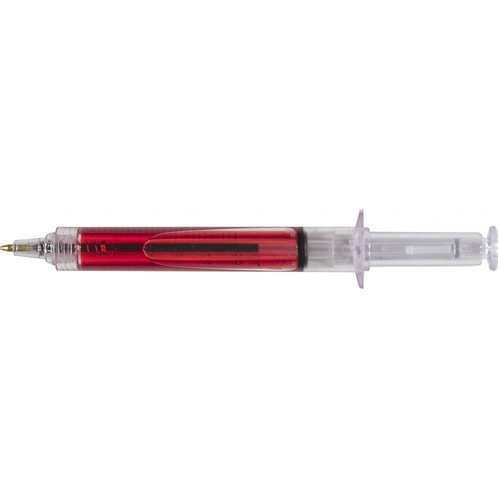 Injekció formájú golyóstoll színes folyadékkal töltve, fekete tollbetéttel.